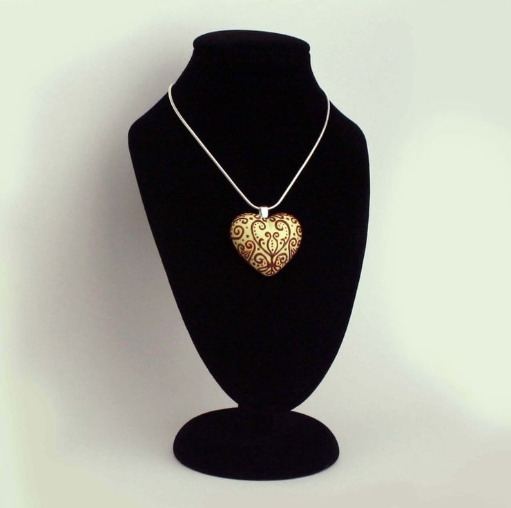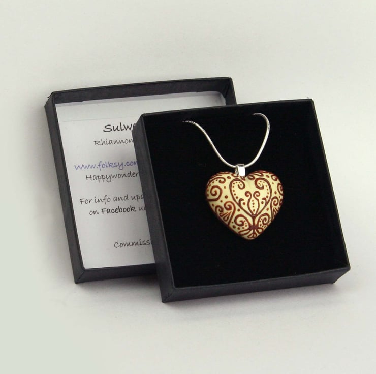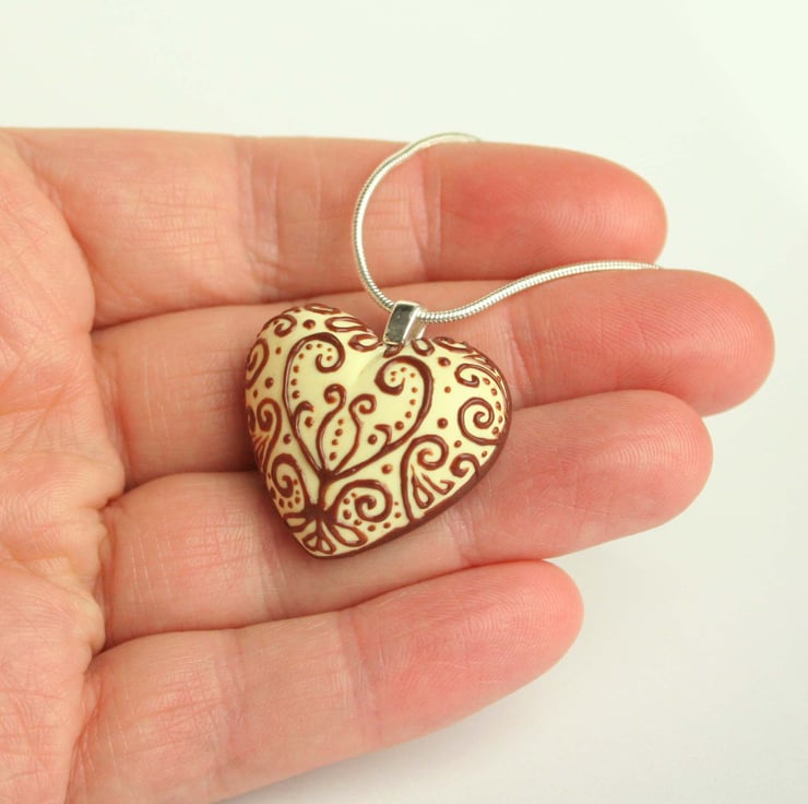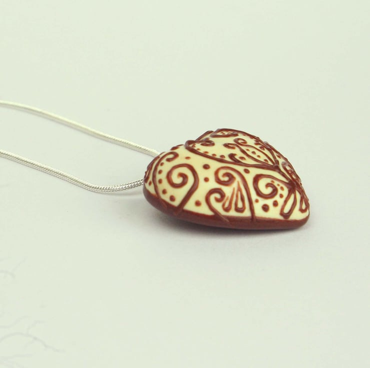 This faux chocolate filigree heart necklace has been hand sculpted in polymer clay and painstakingly decorated using a liquid polymer clay.