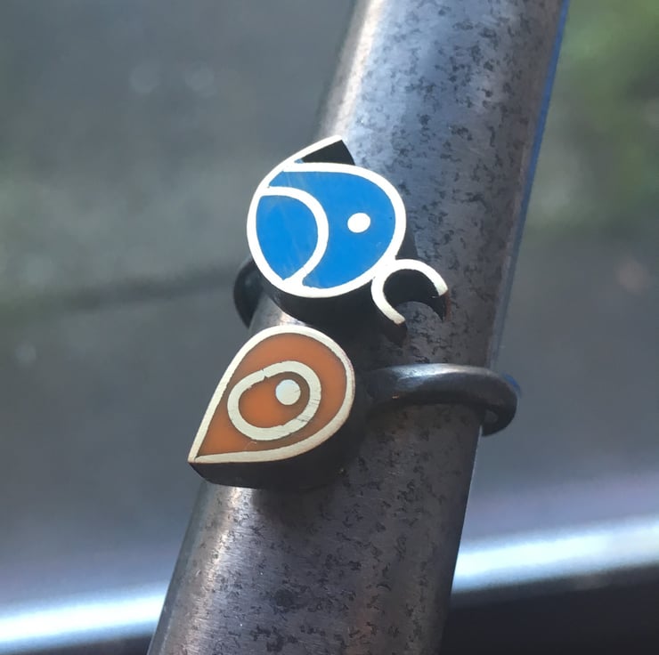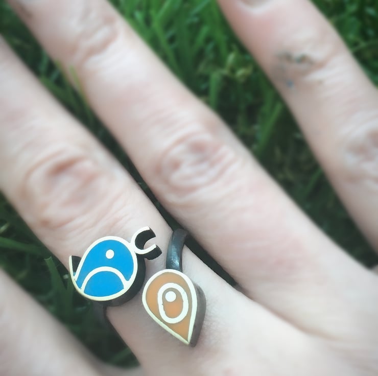 A bird and seed ring in Sterling silver  filled with coloured resin.