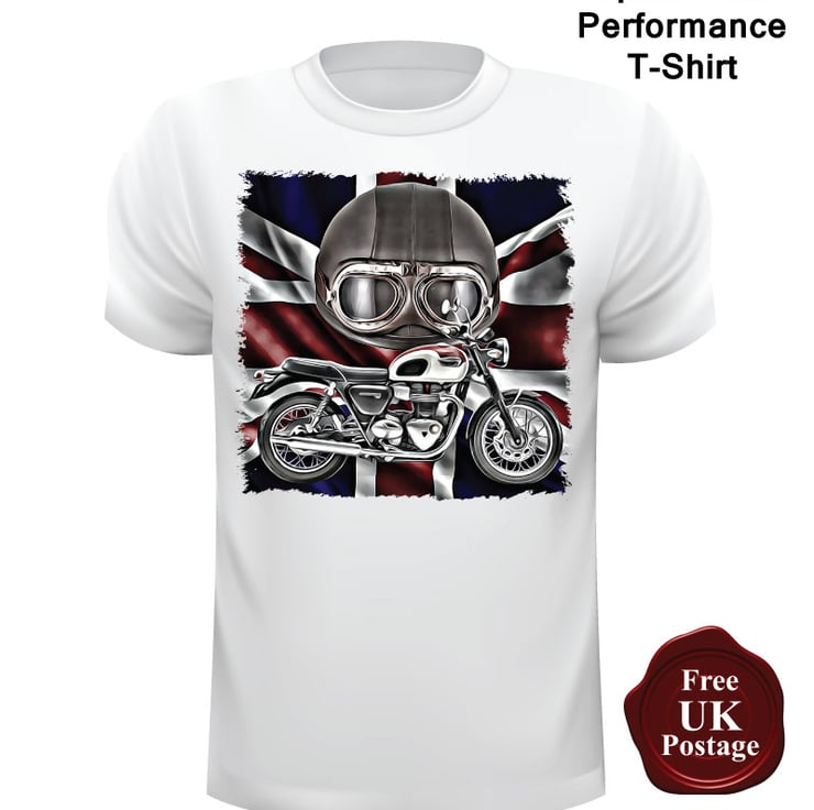 Unofficial British Bike T Shirts, Men’s t shirt, British Bike, Union jack T Shirt, Choose your Size, designed by us Aggies Bags the 169 gsm 100% Polyester cotton feel Ringspun T Shirt is seamed with a single needle 1.9cm collar. Taped neck. Twin needle sleeve and bottom hems. Quarter-turned to eliminate centre crease. Oeko-Tex Standard 100 certified,