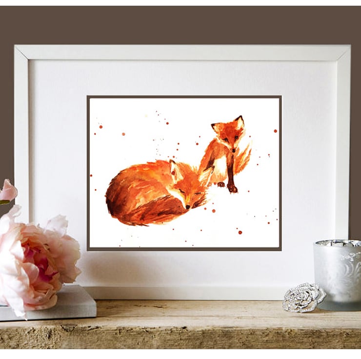 Watercolour Fox Mother & Baby Print - 8x10 inches - £18 - landscape format - frame ready