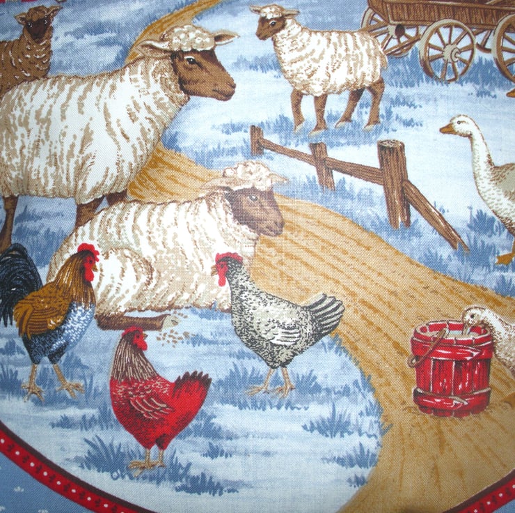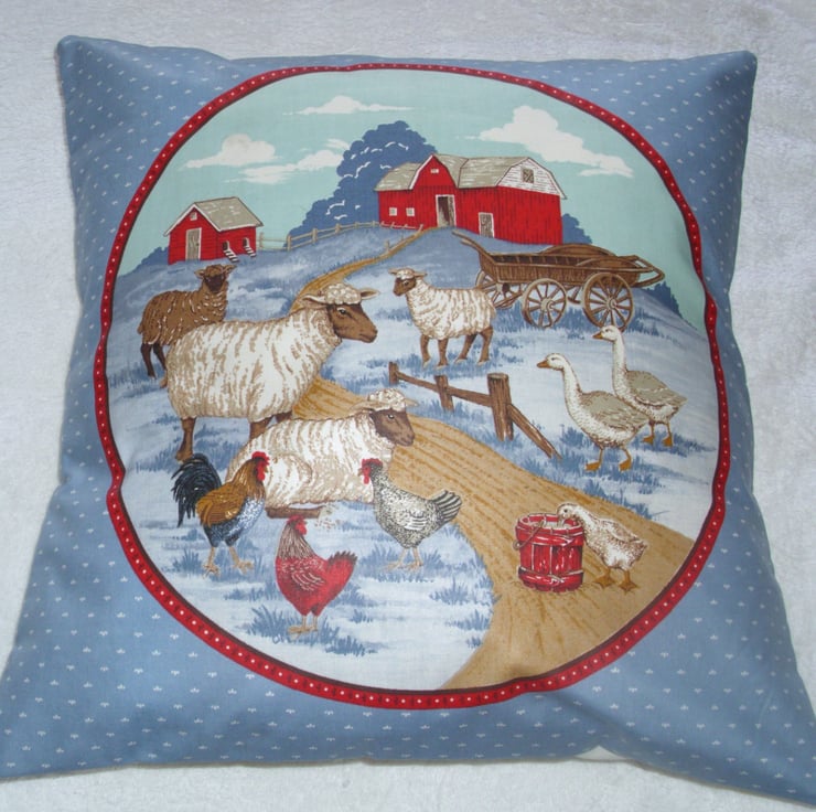 On the Farm cushion with sheep, hens and geese in a field with farm house and buildings up the path behind them. lovely and soft cushion ,would look good in any lounge, sitting room, study or office on any settee or armchair or in a conservatory or summer house or on a bed.
