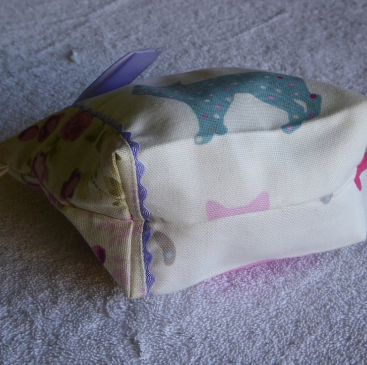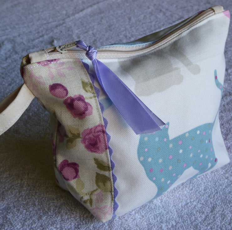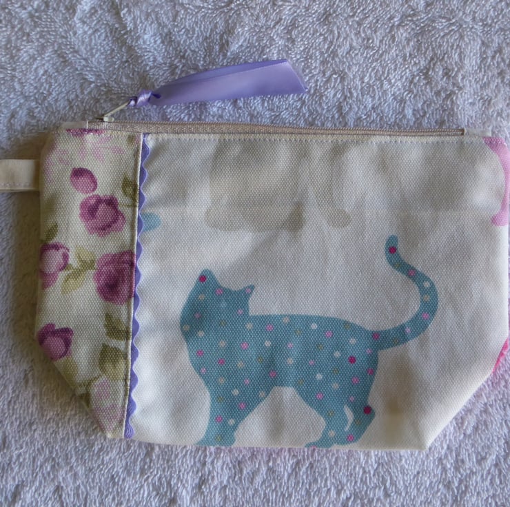 This lovely little purse has been created from a cat print furnishing weight cotton fabric. It has been embellished with a complimentary rose print edging and ric-rac trim. It is fully lined and has a zip closure, with a ribbon pull.