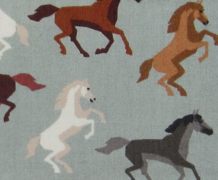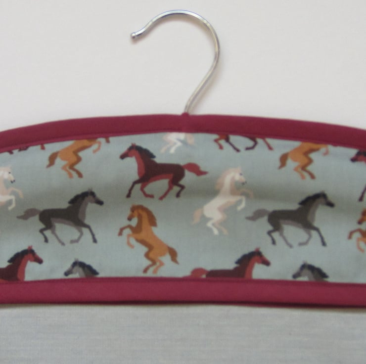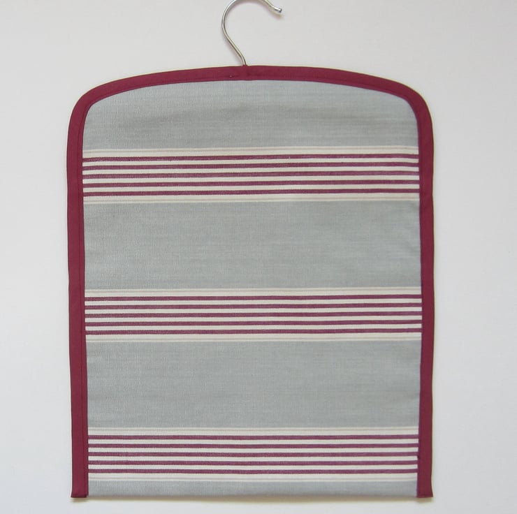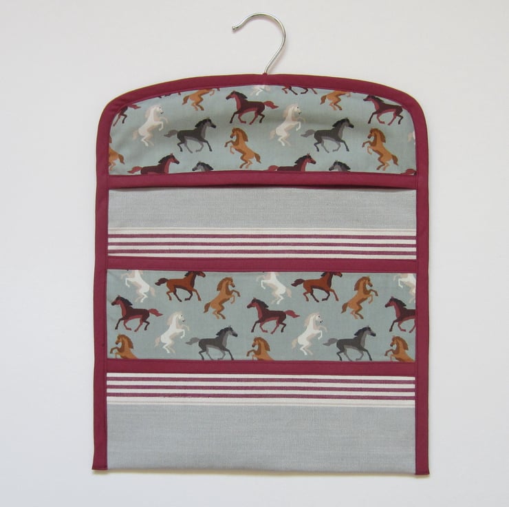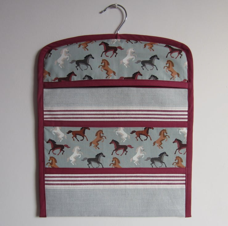 Sturdy peg bag in light grey, cream and burgundy stripe fabric with horse top and panel. It is edged with burgundy bias binding.