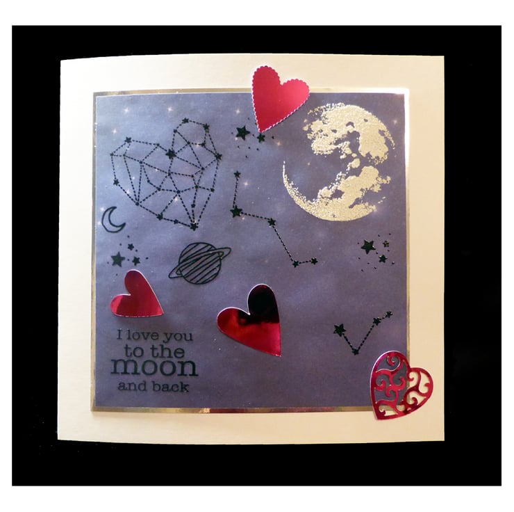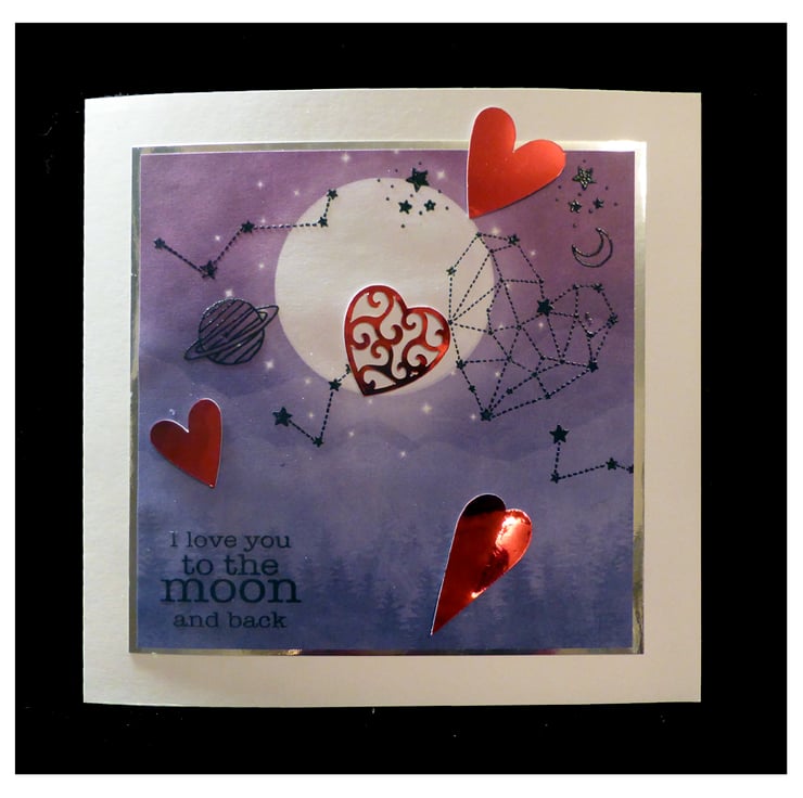 Valentines Card depicting moon, stars and planets. Two options, one is midnight blue, the other lilac and purple.