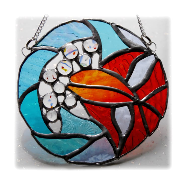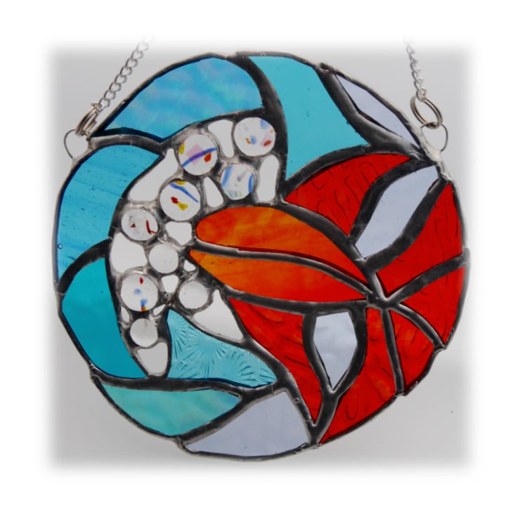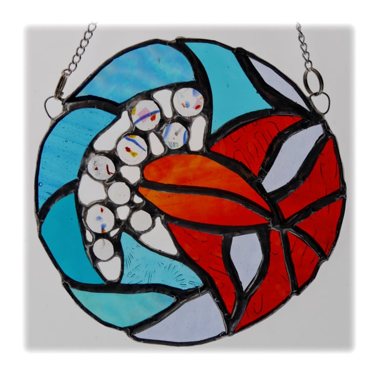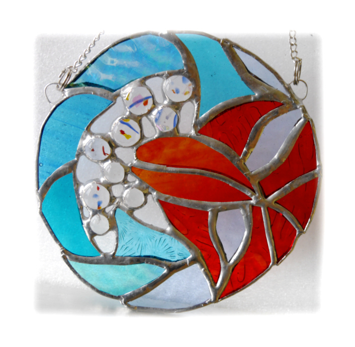 It is 5 in diameter, hangs from a silvery chain and looks stunning. I generally neaten the age of circular suncatchers with a twisted wire frame but for this one I deliberately leave it slightly uneven carrying on the idea of waves round the edge. I think it adds to the charm of the piece.