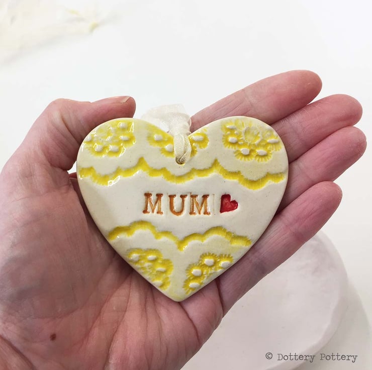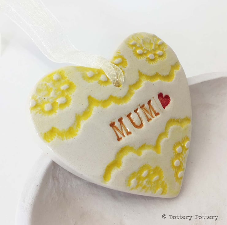 This ceramic heart decoration is made from white earthenware clay and decorated with pattern and colour.