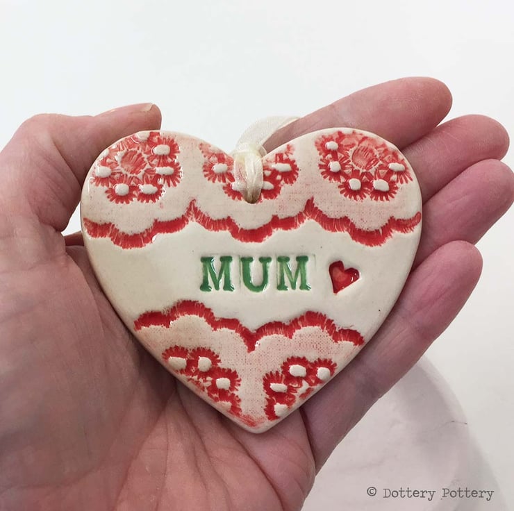 This ceramic heart decoration is made from white earthenware clay and decorated with pattern and colour.