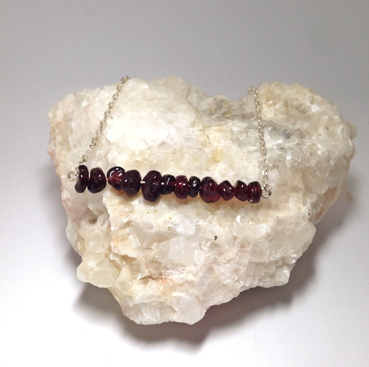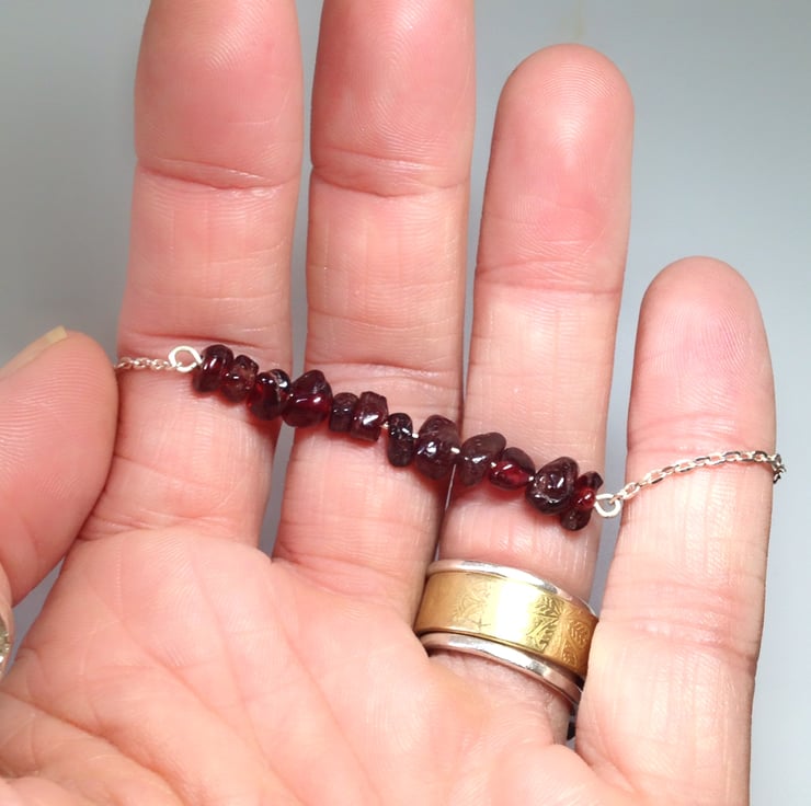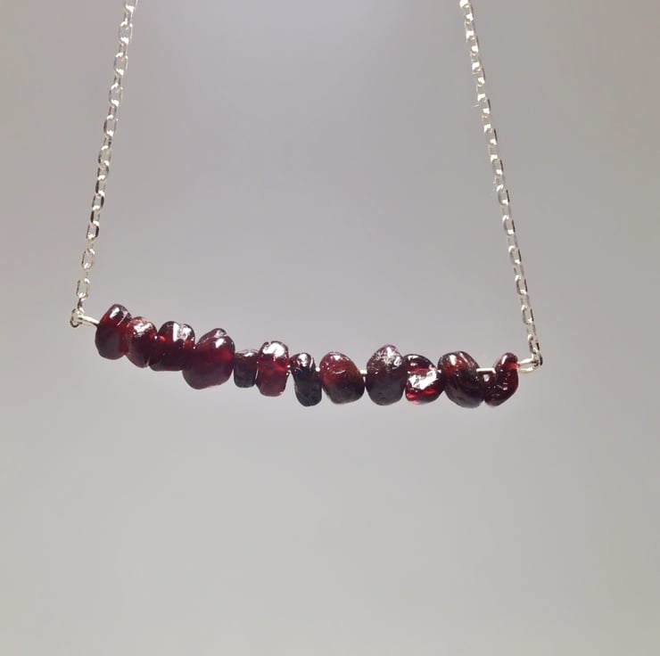 Beautiful raw garnet threaded on silver plated wire, hung from a fine silver plated chain. Very pretty little necklace
