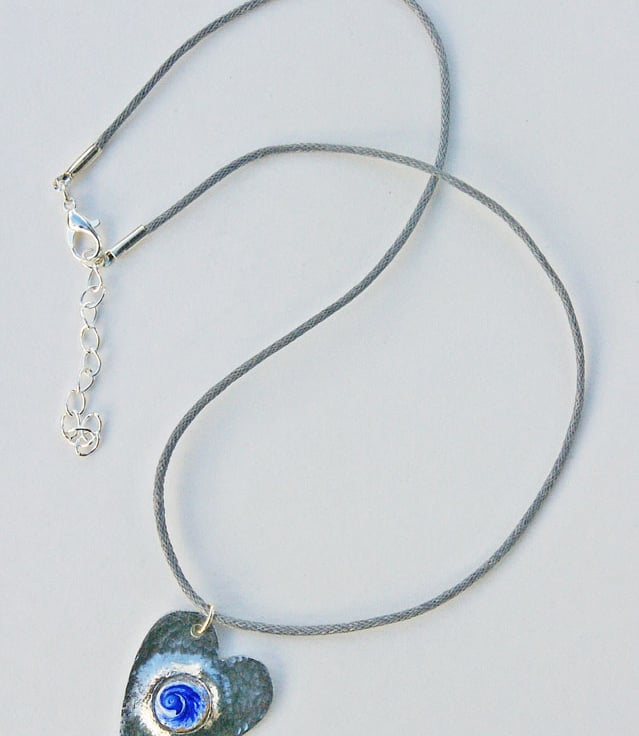 My Silvery Pewter and Swirled Enamelled Heart Pendant is a heart-shaped pendant in polished hand beaten pewter inset with a swirled enamel disc. The heart is approximately 35mm tall and 25mm across at the widest point, the enamelled disc is about 9mm in diameter. This pendant hangs on a 16" 42cm grey cord with a claw clasp and a 3.5cm chain extender. A variety of colours are available, please see the images of multiple pendants to choose a colour from the list. Starting with Pink and working clockwise, the second of these images shows the currently available colours, one of each is ready now, but more can be made for you - please ask. The pewter heart pendant is presented in a gift box and supplied in a protective outer corrugated card box, sent by Royal Mail 'Tracked' delivery.