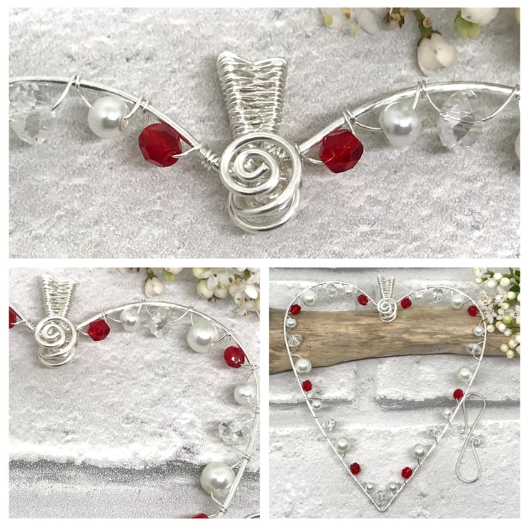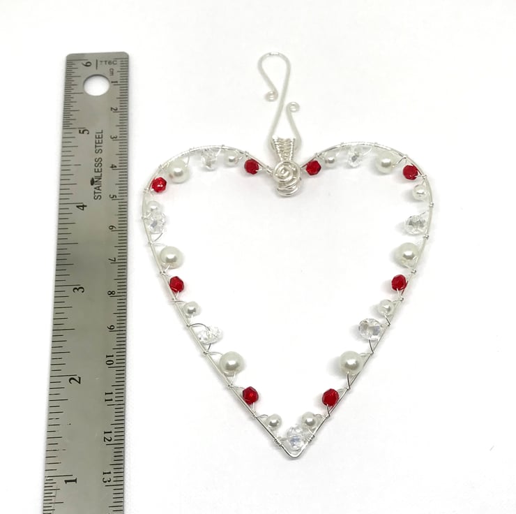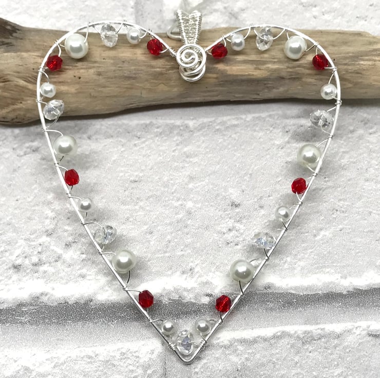 This pretty heart is handmade made with silver filled wire and a selection of red and clear Czech crystal beads, and white glass pearls. I have formed the silver wire into a heart shape and wrapped the beads around the heart shape. A handcrafted hook is included for hanging the heart.