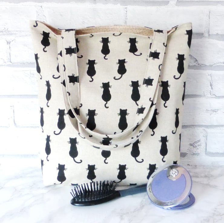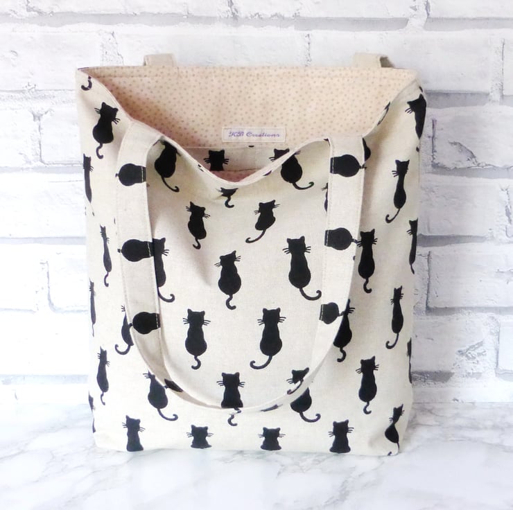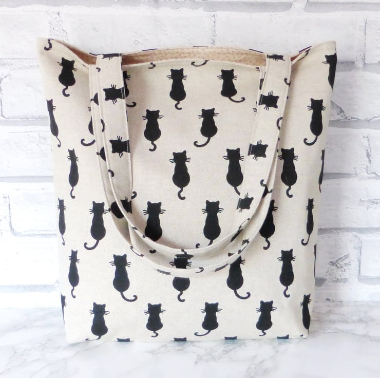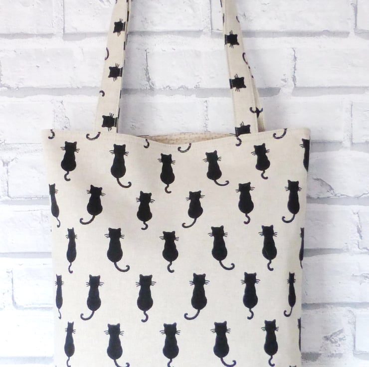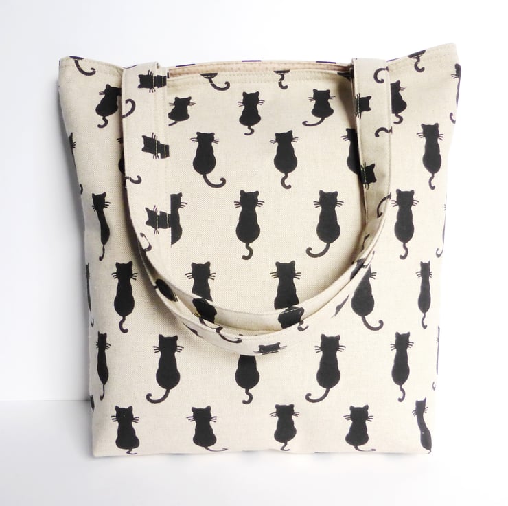 A medium sized strong tote bag/shopping bag made from canvas fabric with black cats on a natural background.