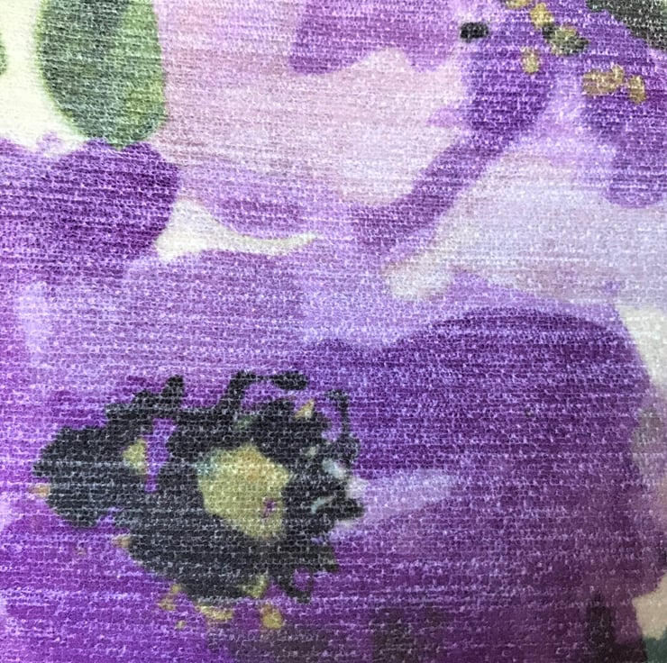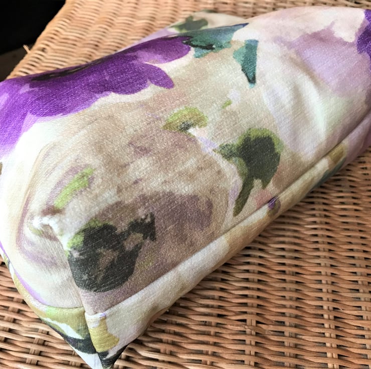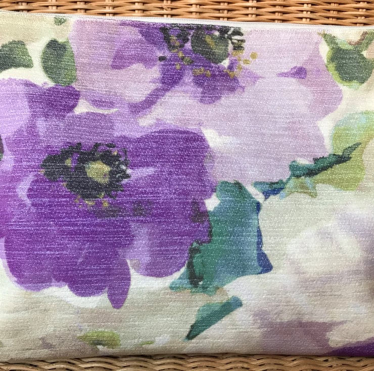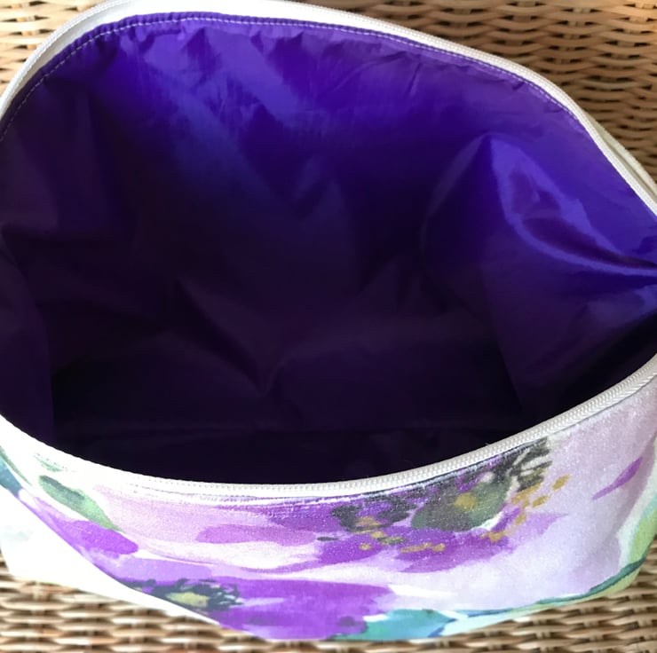 A pretty toiletry bag in cream fabric with a lovely print pattern featuring large purple and lilac flowers and green foliage. The bag fastens with a cream zip and the inside is fully lined with a purple water-resistant lining. The base of the bag is boxed giving a spacious interior.