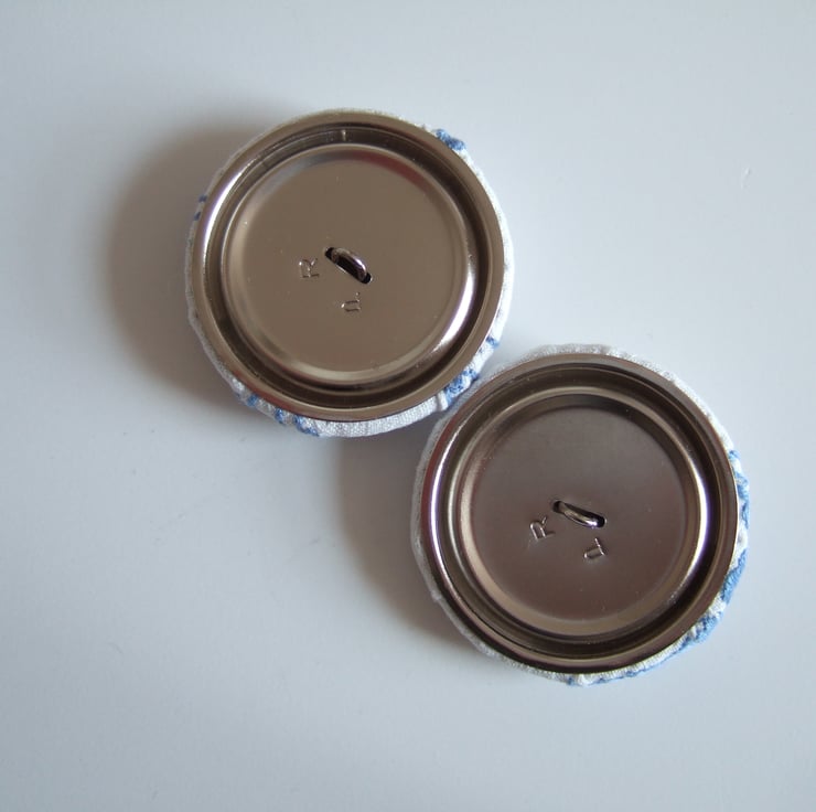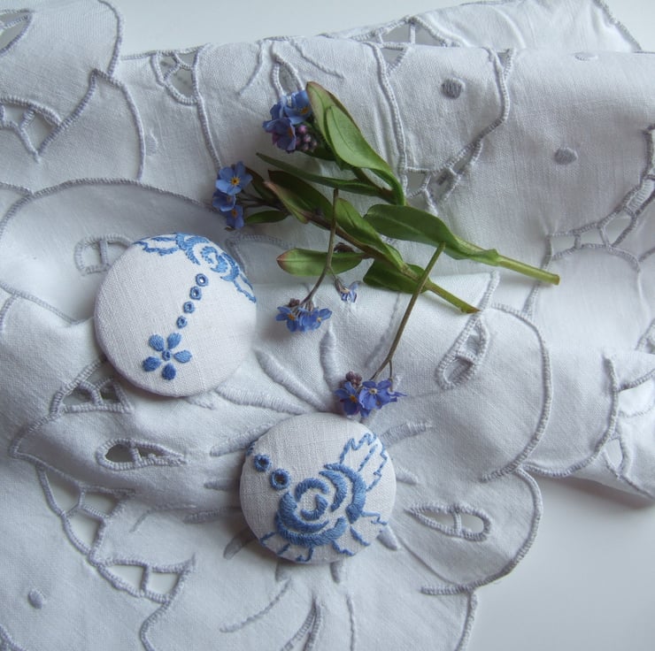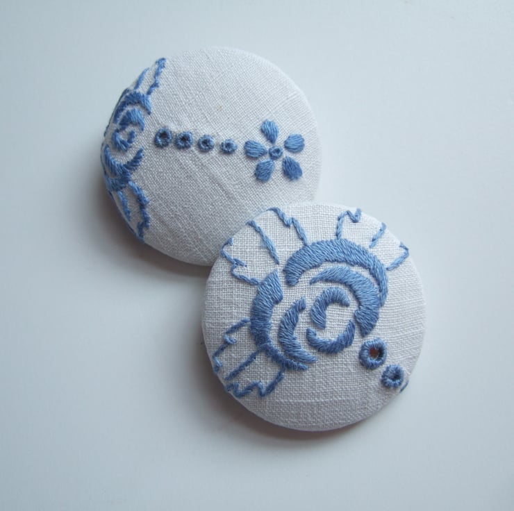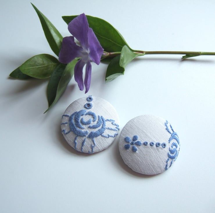 This pair of extra large metal buttons, are covered in hand sewn vintage embroidery. Tiny fragments of homemade table linen, which have been rescued, and given a new life and purpose.
