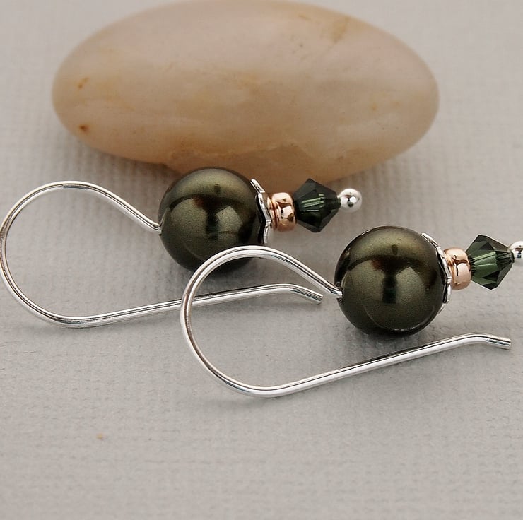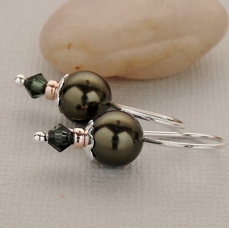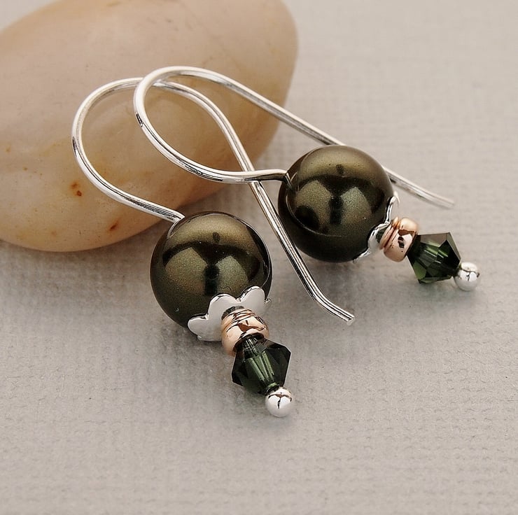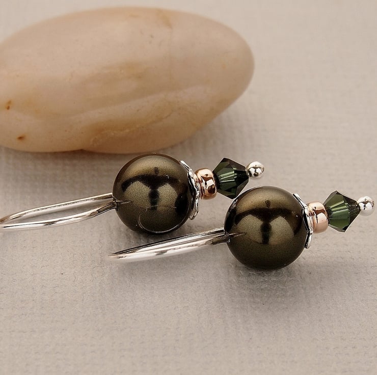 Dark Green Swarovski Pearl Earrings - Sterling Silver - Gifts