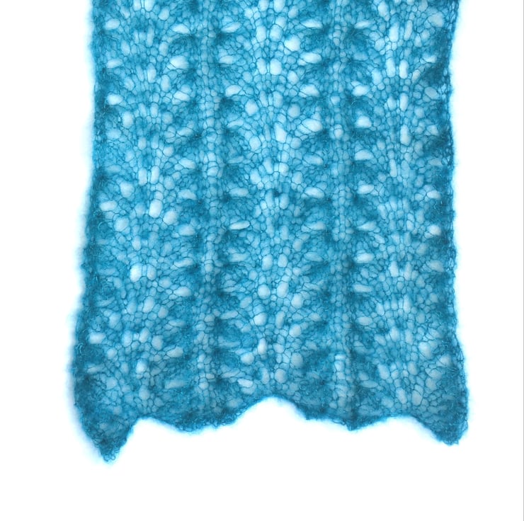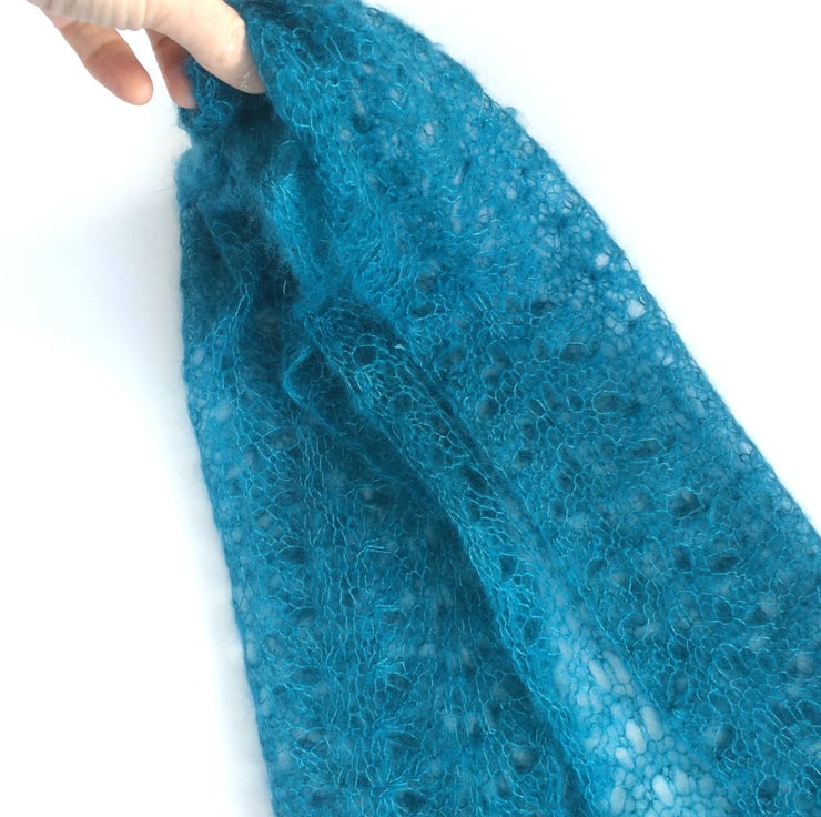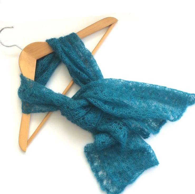 Teal Blue lace scarf hand knitted in kid silk haze yarn (mixture of kid mohair and silk). Wonderfully soft and knitted in an open lace pattern showing off 2 ruffles that run down the centre of the scarf. Slight curved edges to each end of the scarf.