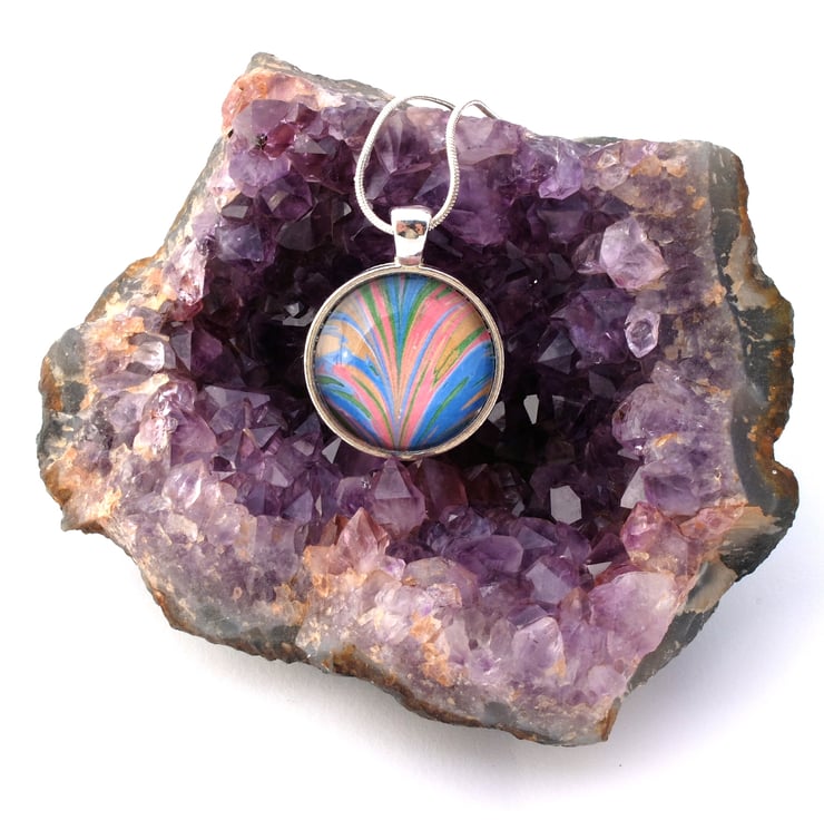 This pretty pendant features a piece of my marbled paper set into a silver plated setting and capped with a clear glass cabochon. Featuring some sparkly metallic gold paint with blue, pink and a little of green makes it a gorgeous focal piece.