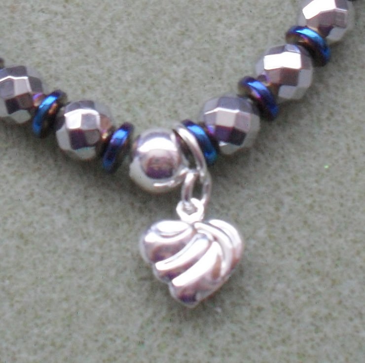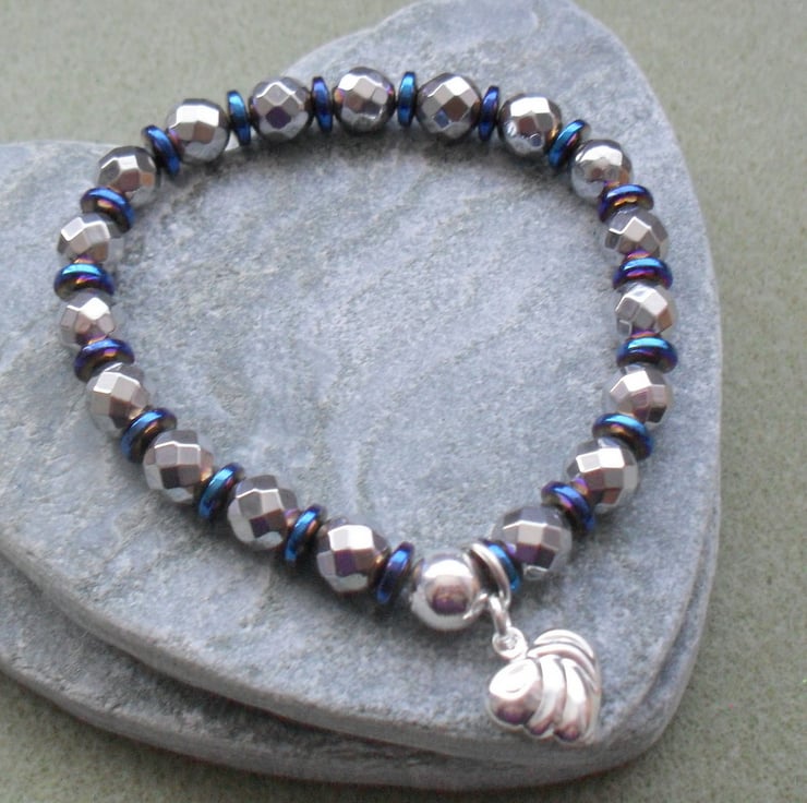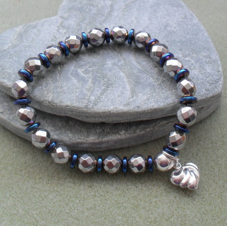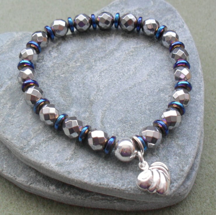 Stretch bracelet with 8 mm faceted silver coated haematite and spacers of blue coated haematite are beaded onto elastic.