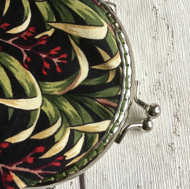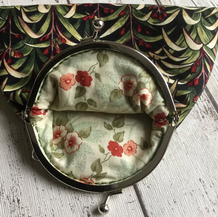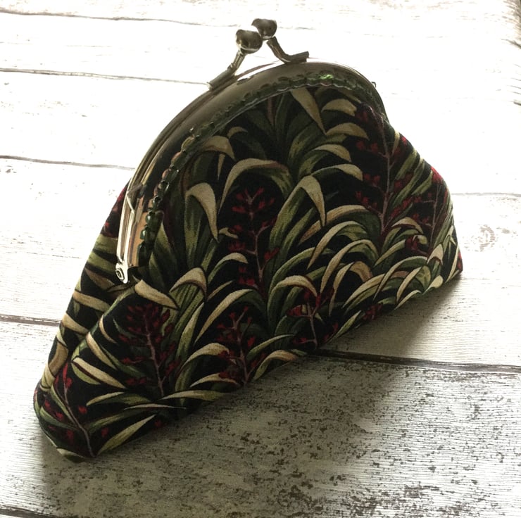 This fun little purse is created from a hard wearing cotton fabric in a frond and red flower design in shades of green, cream and red on a black background. The boxy bottom of the purse allows it to stand up on its own and though probably too large to use as a coin purse would make a great container for your treasures or attach a chain to the clasp and use it as a mini handbag.