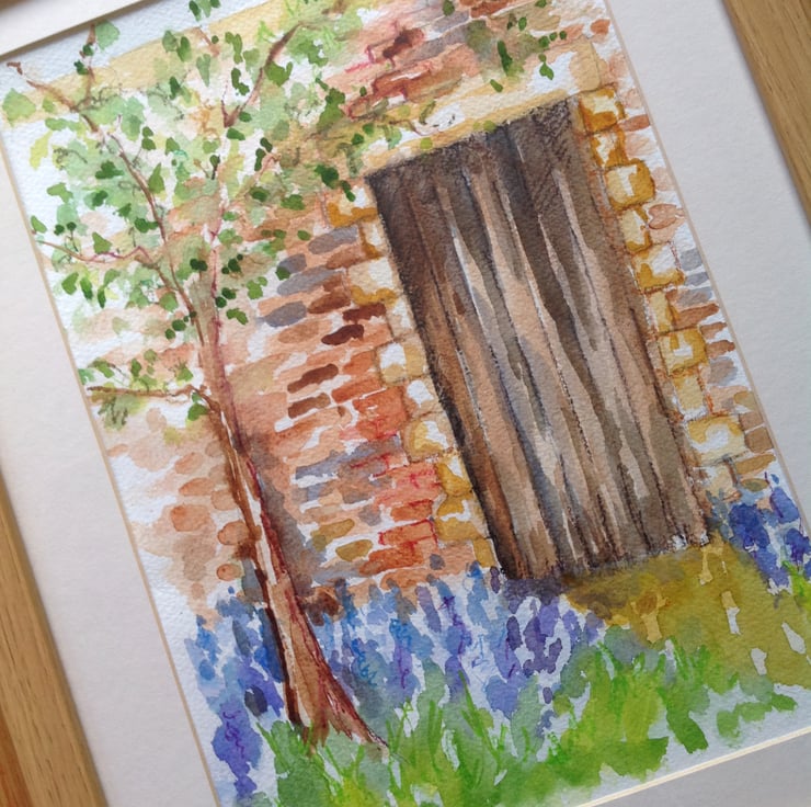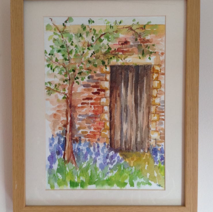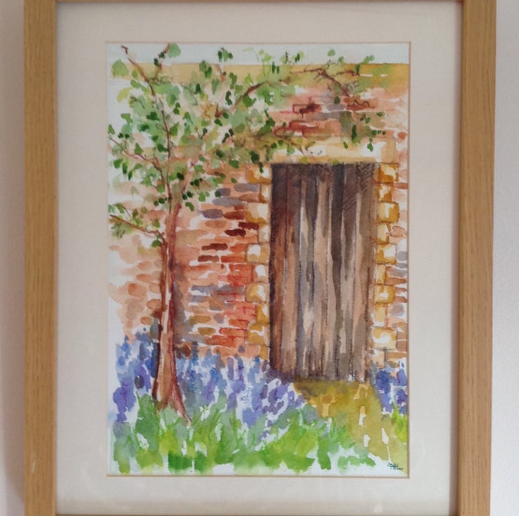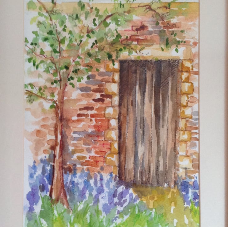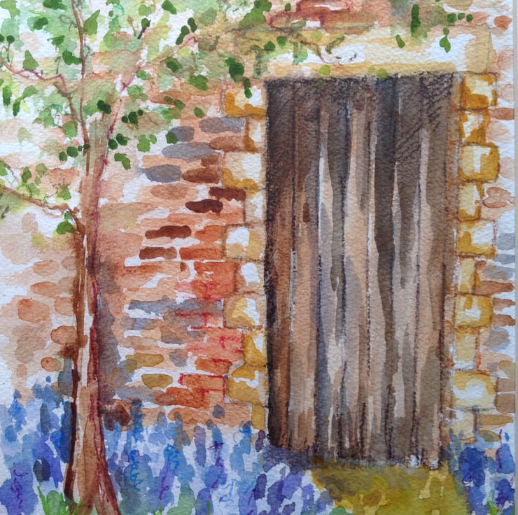 The Garden Door - a contemporary piece of art created with watercolour paints and pencils, based on visits to walled gardens in the Spring when the Bluebells are in full flower.