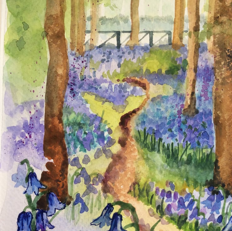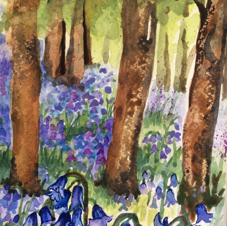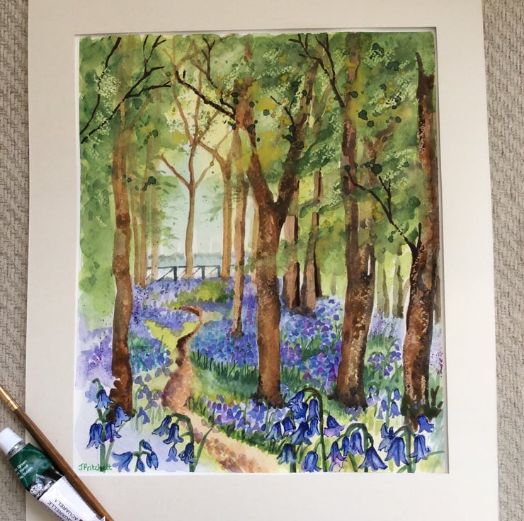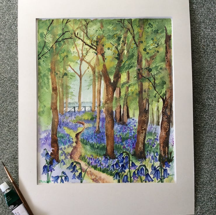 This is an original watercolour painting depicting a wood in the spring covered in a carpet of bluebell flowers. Defined bluebell flowers can be seen clearly in the foreground of the the painting which slowly become more impressionistic as they recede into the background.The painting has been created using watercolour paints on watercolour paper. Different watercolour techniques have been used such as wax resist, wet on wet and splattering which are unique to my style of artwork. The painting has been mounted and signed. The measurements are approximately 30cm x 41cm which includes the mount.