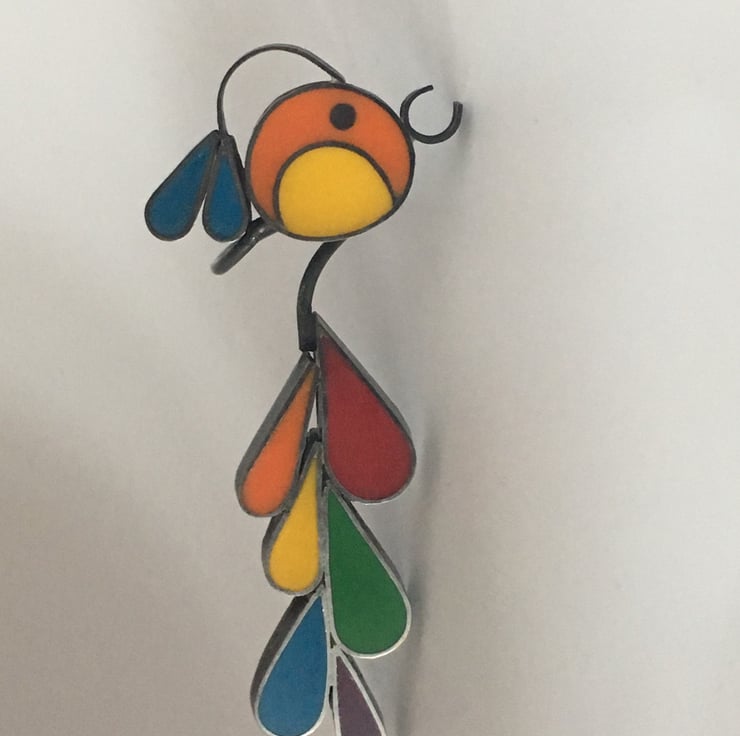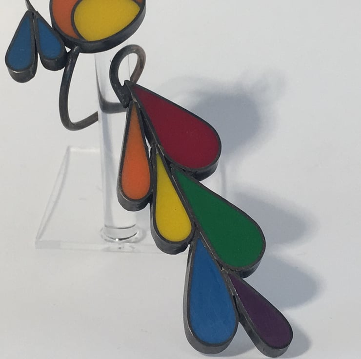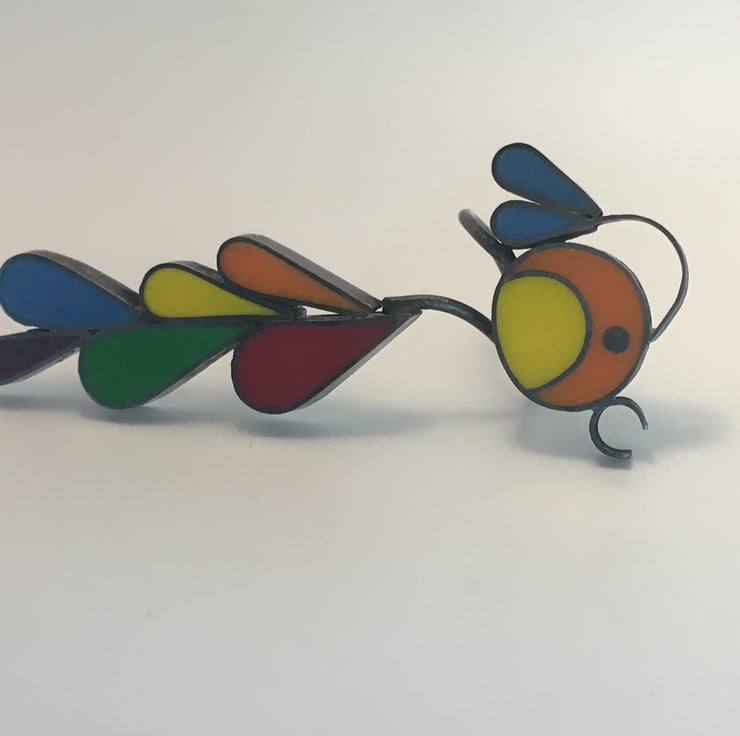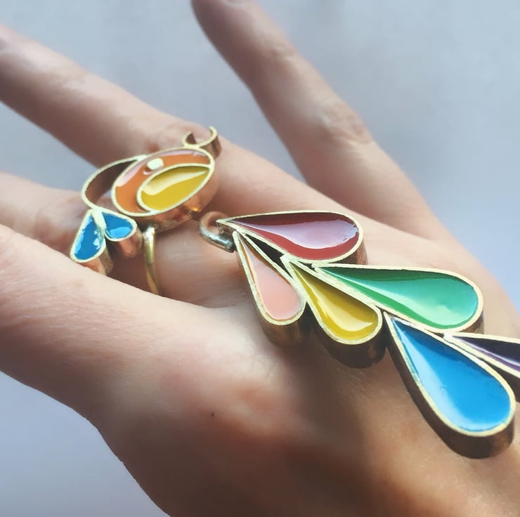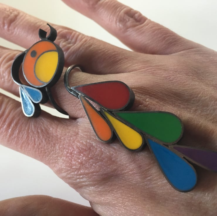 This statement rainbow bird ring is made to order in brass with a sterling silver ring band using hand cut strips of metal that are then formed and soldered individually onto a base, then each section is painstakingly filled with hand mixed coloured resin that is polished to a shiny finish.