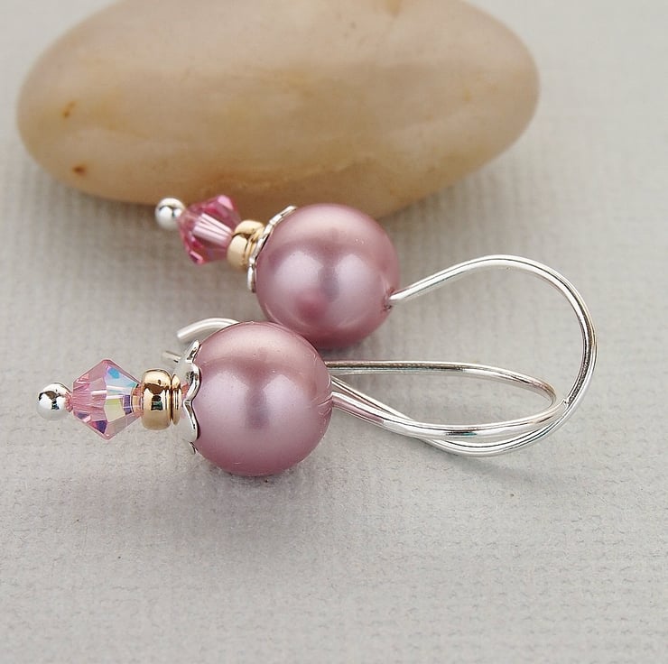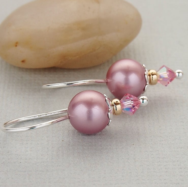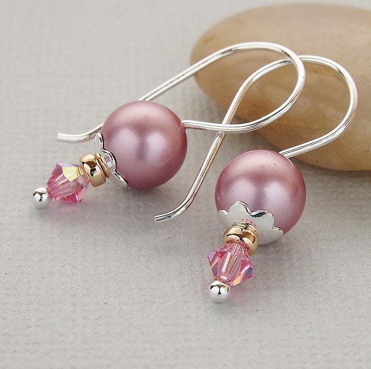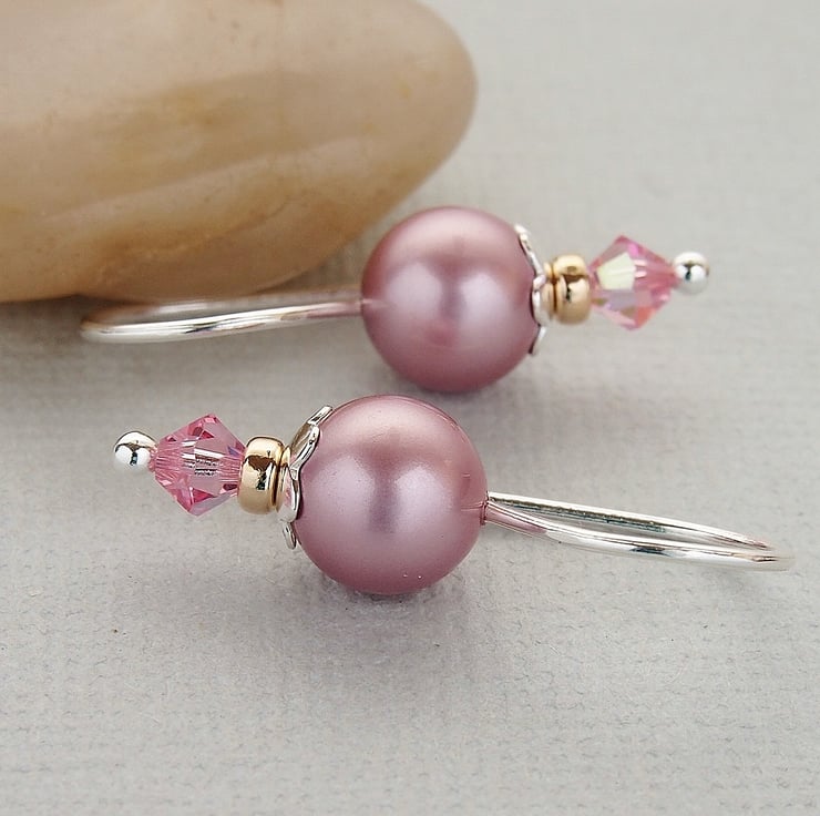 Pink pearl earrings handmade using 20g silver wire on which have been threaded a Swarovski crystal glass pearl in Powder Rose nestled in a sterling silver daisy beadcap and a gold filled bead with a Swarovski crystal bicone in Light Rose ab.