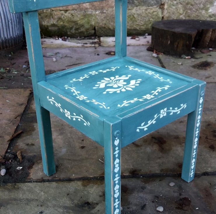 Little rustic primitive Children's chair painted in a deep green with folk art stencil design in white