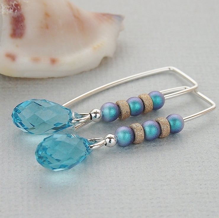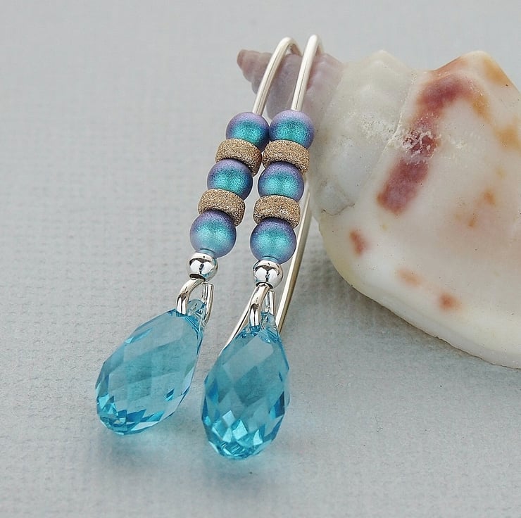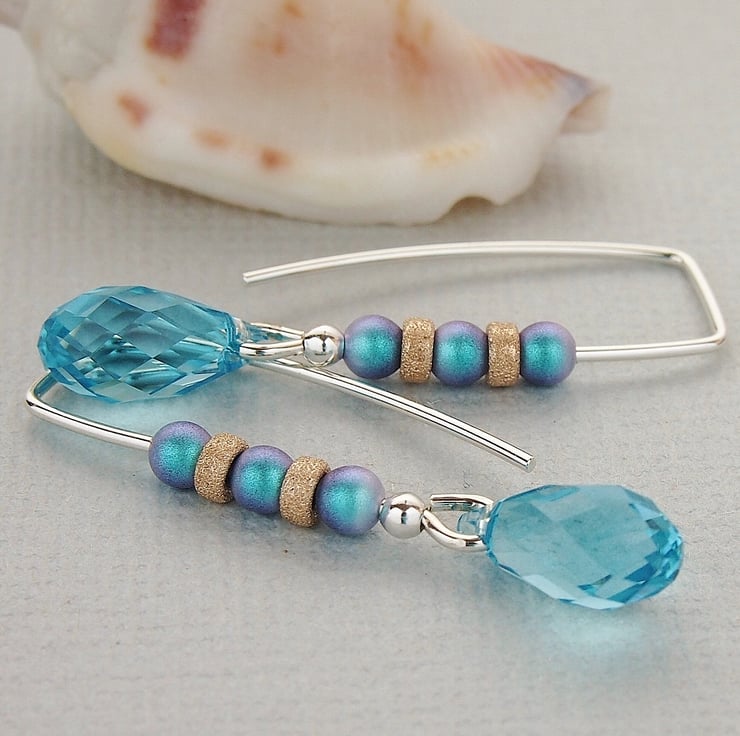 Handmade silver threader style earrings featuring iridescent light blue Swarovski crystal glass pearls interspersed with frosted gold filled beads and finished with a simple Swarovski crystal drop.