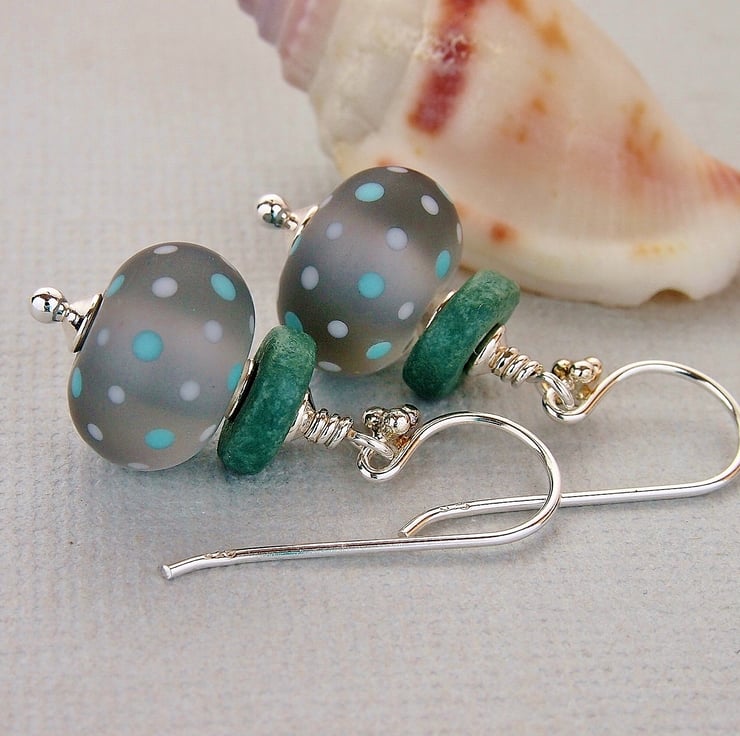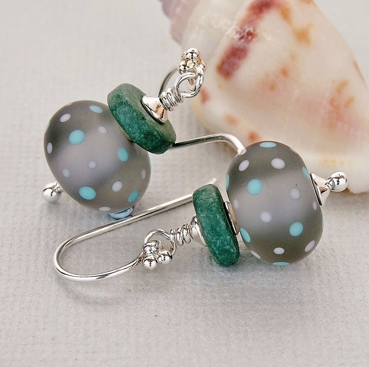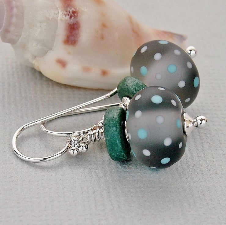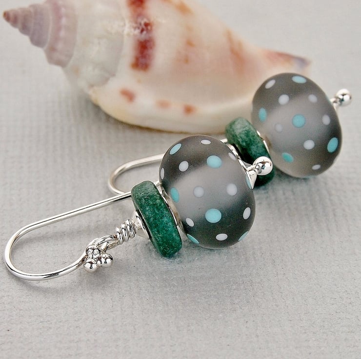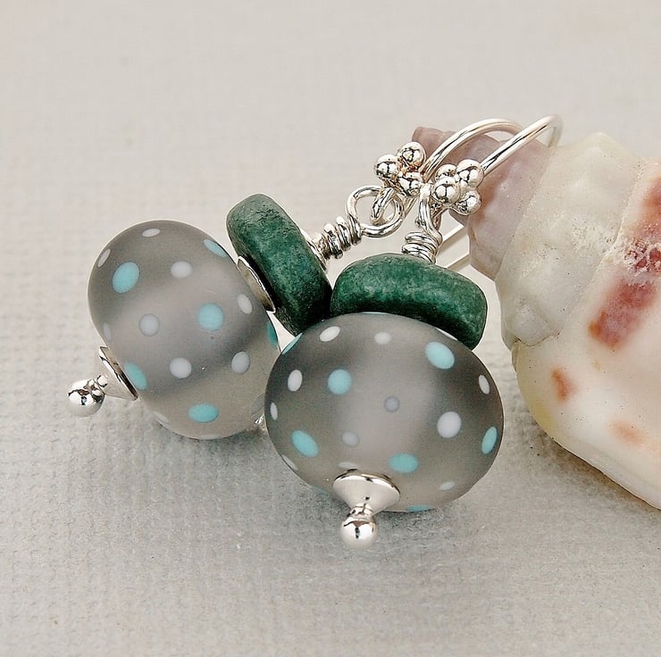 Pretty earrings featuring polka dot beads by Laura Sparling. These gorgeous beads are a lovely shade of grey with polka dots in grey and teal and have been etched giving a soft flattering stonewashed look.
