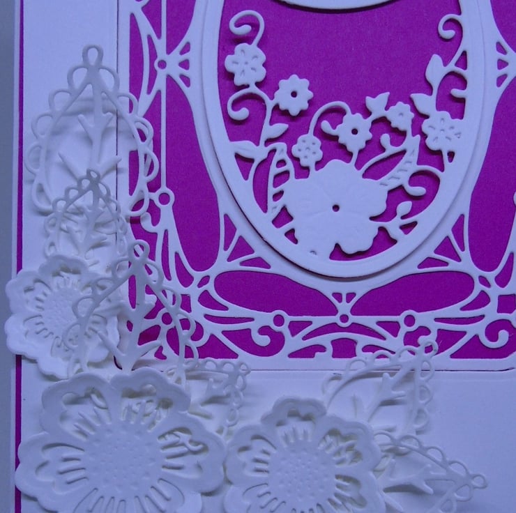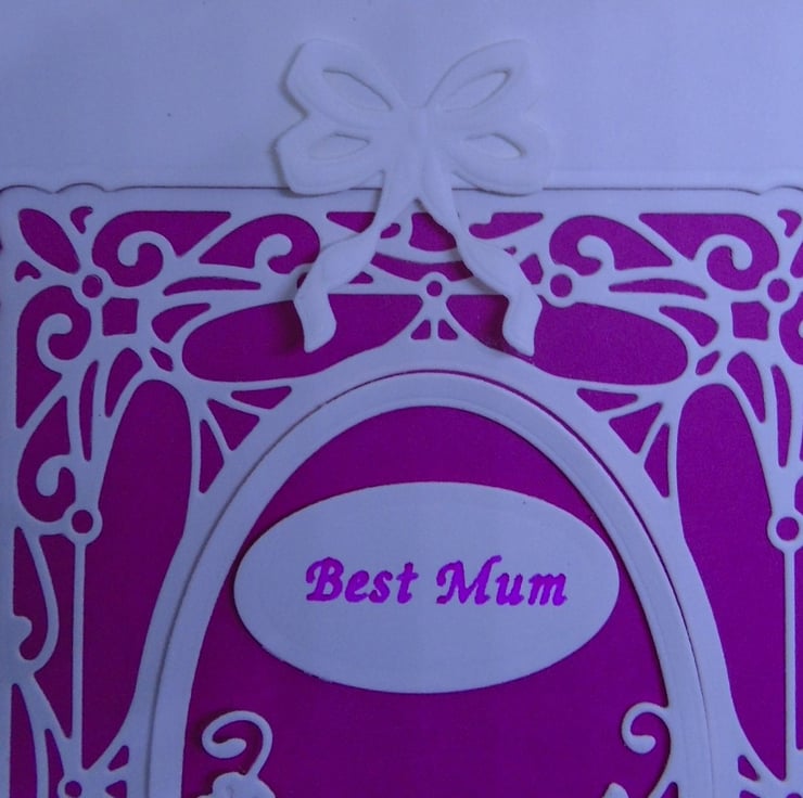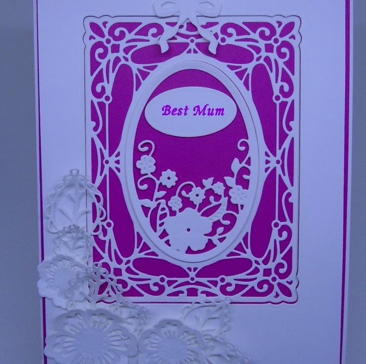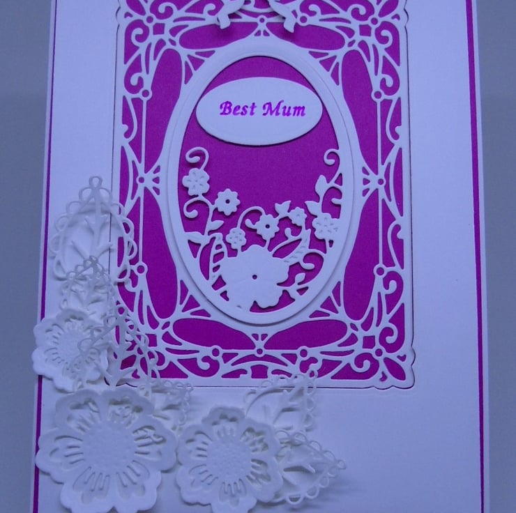 This card is A5 size and made with coconut white card 220 gsm in weight, it has a mat and layer of raspberry colored card as well that the trellis is back onto, with a frame of coconut white card with a flower center, there is a cartouche just above the center flowers with Best Mum in Pink, below in the corner left side are flowers and leaves all in coconut white card. the card is lined inside with crisp white paper, this card comes with a hand made envelope. I have left this blank for your mothers day message.