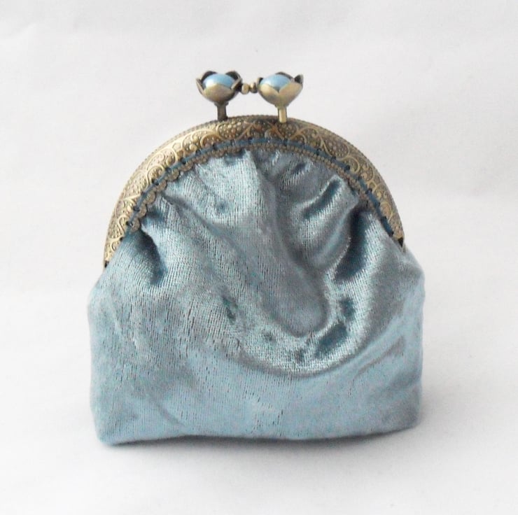 This lovely aqua crushed velvet coin purse is hand sewn into a bronze frame with an embossed filigree design. The clasp resembles two flower stems cupping soft green/blue beads. The lining is a gorgeous teal satin and the purse has been sewn into the frame using toning thread. A great sized purse to fit in your evening bag.