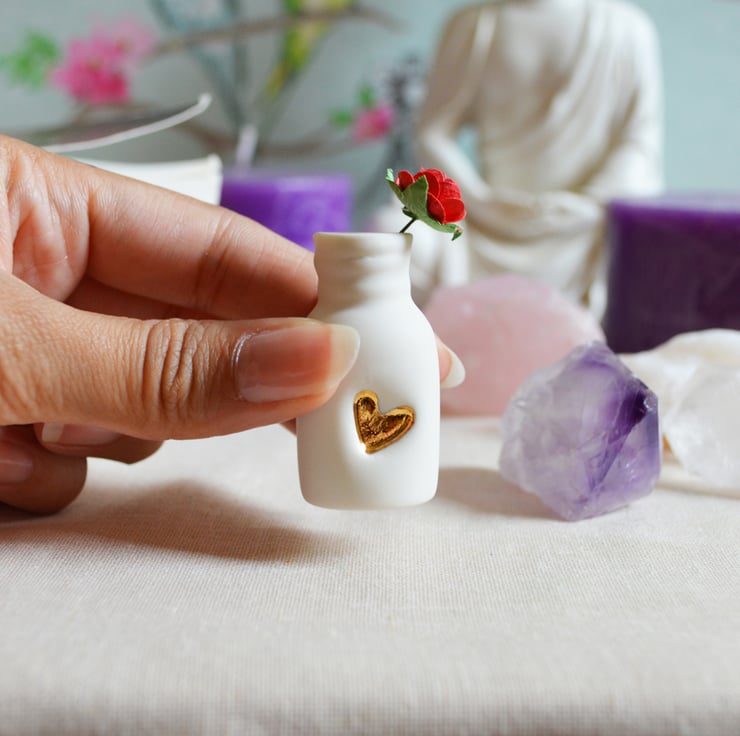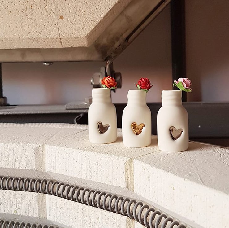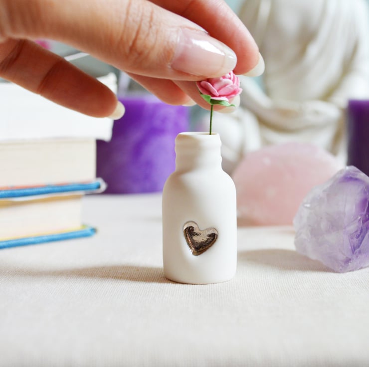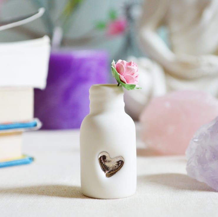 Finished Matte, this pretty little handmade ceramic platinum/gold lustre embossed heart bottle is the perfect little extra gift for Valentines or a little keepsake! Hollow inside.