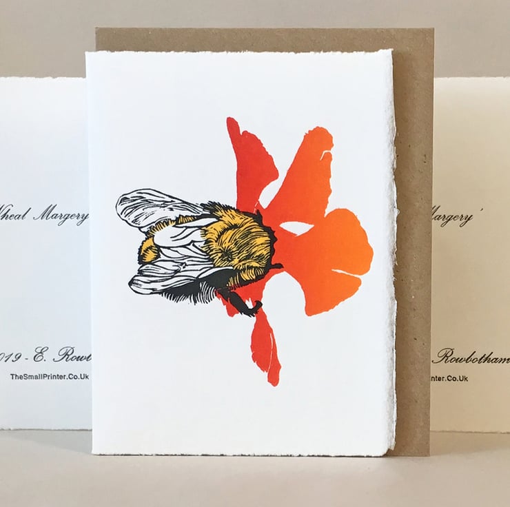 This little Ginger Carder Bee perches skilfully on a wild balsam blossom with its head buried determinedly collecting pollen. I've coloured the flower with a blend of vibrant red to rich orange giving it depth. I achieve this during hand inking the flower lino block. The bee is also hand inked, in a seville black. I've hand printed this 3 times, on my old Albion Press to achieve the final image on artist paper which I then fold to form a card.
