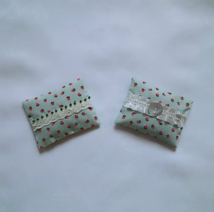 Both bags have either ribbon and button or lace and beads embellishments to the fronts.
