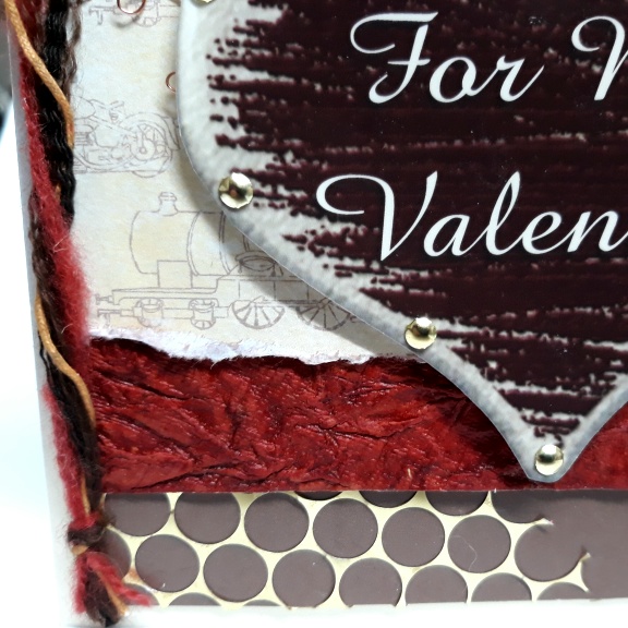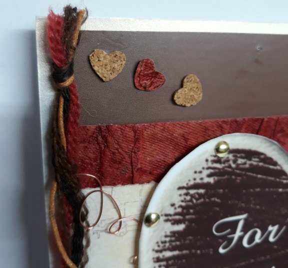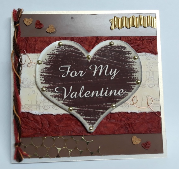 For this wooden heart valentine card I have used a chocolate brown card with a lovely textured handmade paper across the center with a torn piece of patterned paper featuring various vehicles on top, I have placed gold coloured brads around the heart and added gold sequin waste, copper wire, mixed fibres and little punched hearts to embellish, all this is on a pearlised card which depending how the light catches it, looks pearly silver or gold, you can just see it in the second photo.