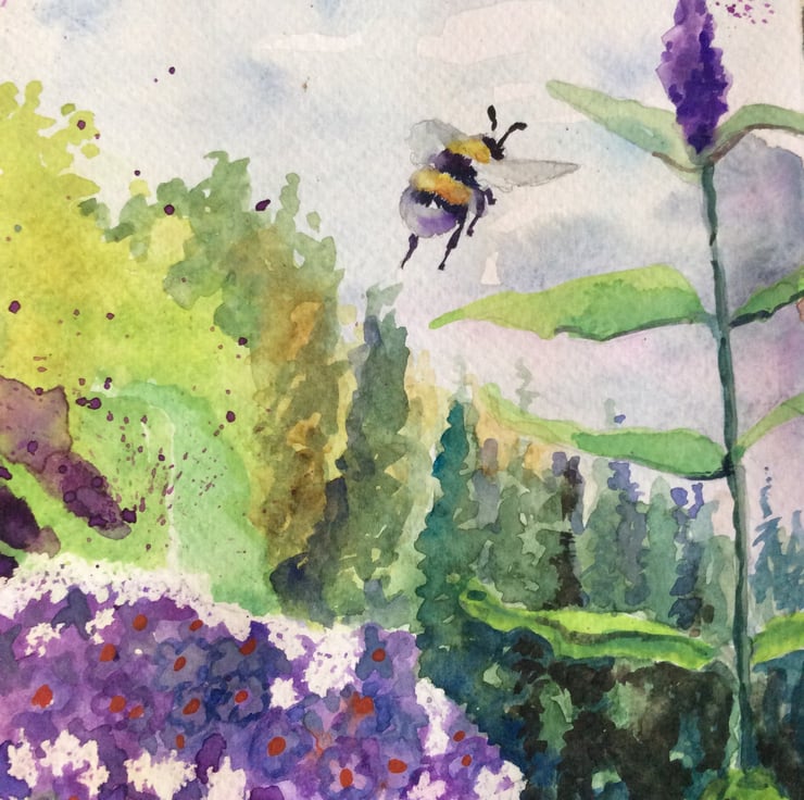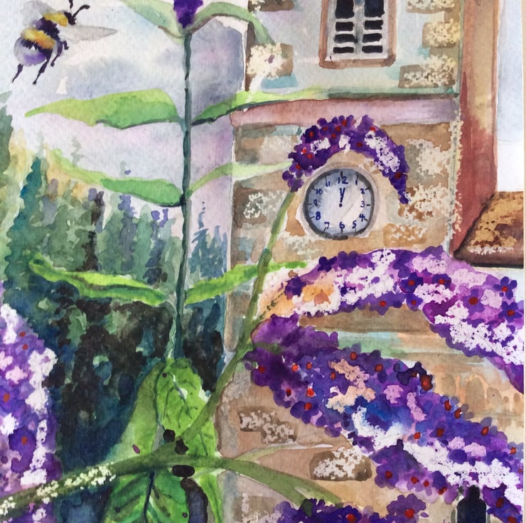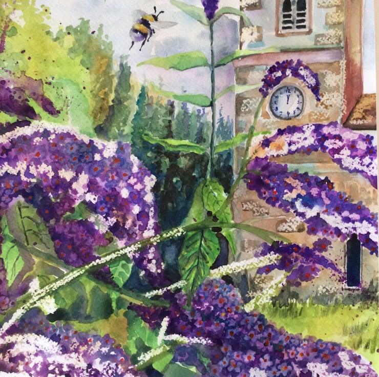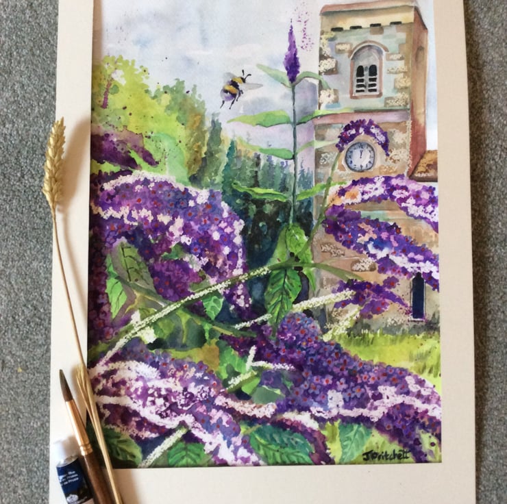 This is an original watercolour painting not a print of a church with purple buddleia. Large buddleia flowers can be seen in the foreground with a church in the background and a bumblebee flying by. I use a range of watercolour techniques to create my artwork such as wet on wet, wax resist and splattering. The painting has been created using watercolour paints on watercolour paper , mounted and signed. Measurements are approximately 31cm x 42cm which includes the mount.