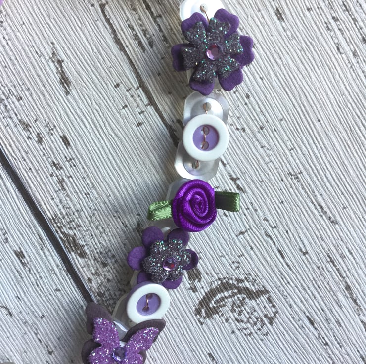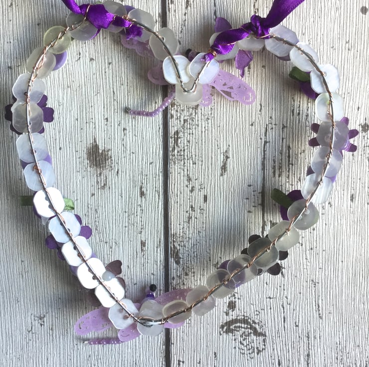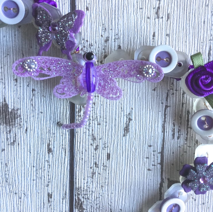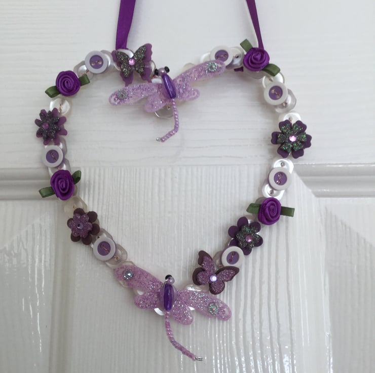 This beautiful hanging decoration , (box not included), is created from a hand shaped piece of wire with a base of off white coloured shirt buttons sewn onto it with copper wire. A second layer of mauve buttons with a white edge are dotted around the shape. Two dragonfly decorations made from beads and acrylic adorn this heart together with ribbon rose, paper butterflies and flowers which are attached on with silicone glue. A deep mauve satin ribbon measuring approx 31cm has been sewn onto the shape so that it can be hung up.