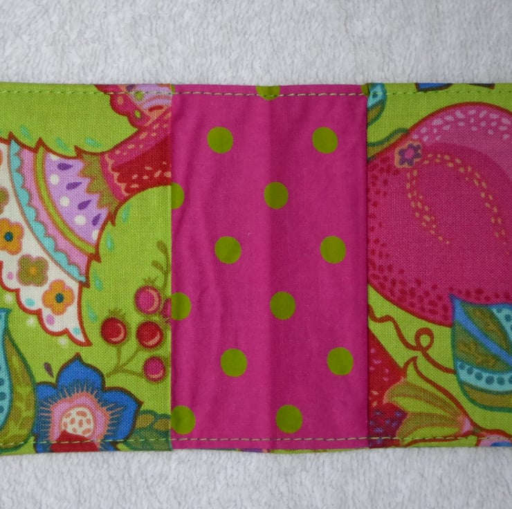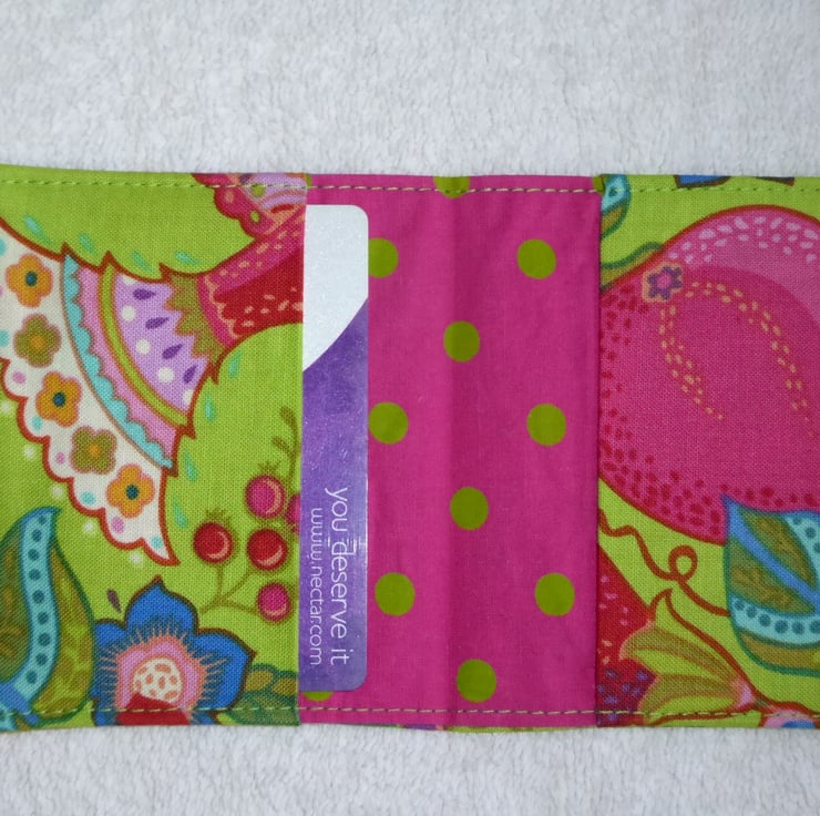 I have designed and created this handy flip card wallet to hold 2 credit cards. The holder is created from cotton fabrics, with interfacing to give structure.There are 2 small interfaced pockets for your cards.