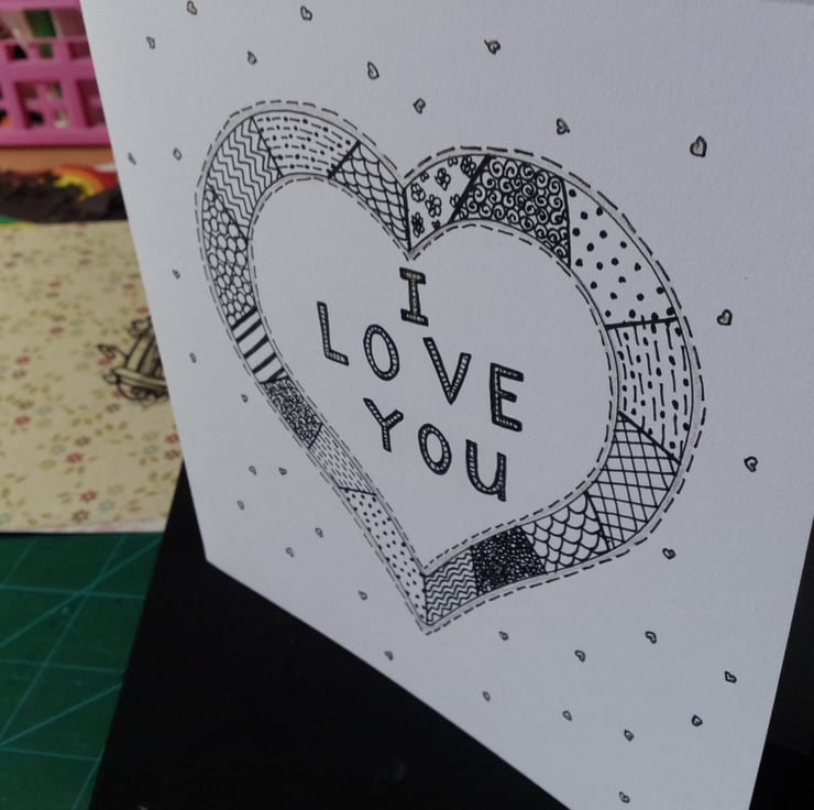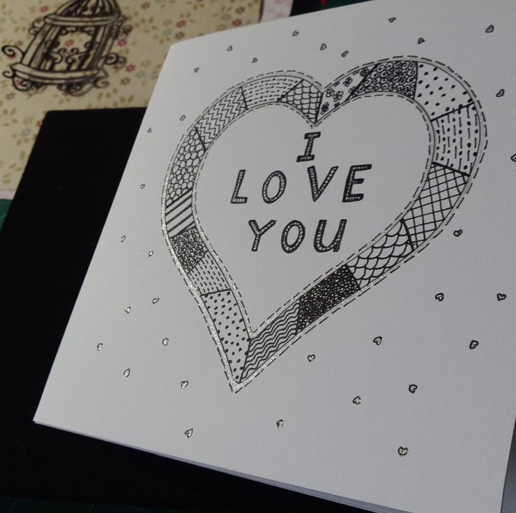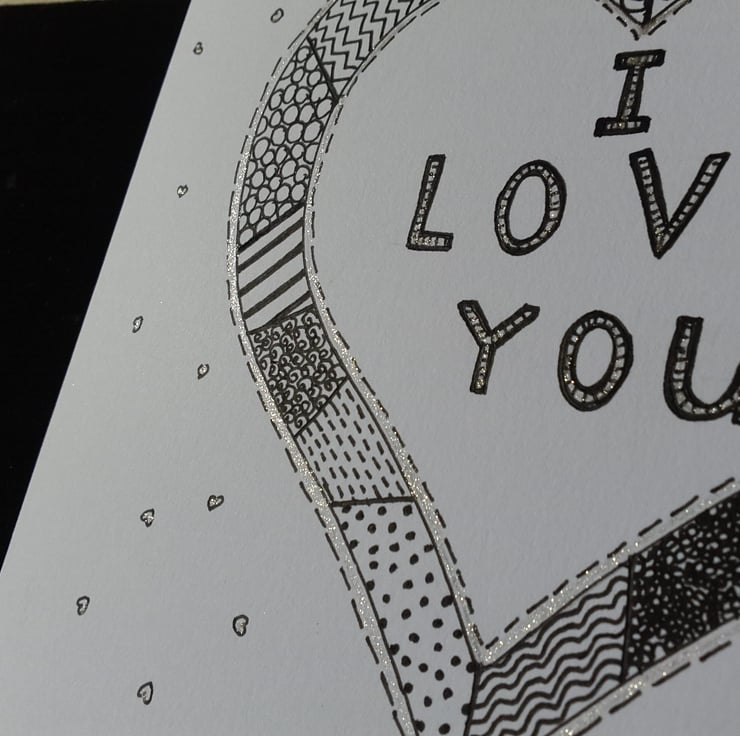 A completely handmade and uniquely designed card. Consisting of a heart hand drawn in pen and ink. I love you in the centre and tiny hearts in the backroom . Highlit with silver. All on quality pristine white card.
