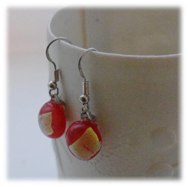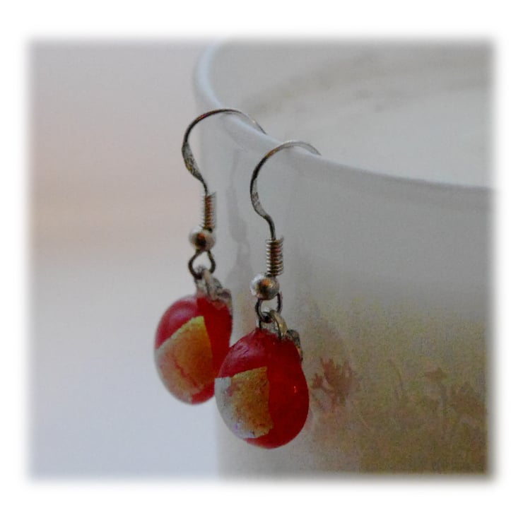 The earrings are hung from silver plated bails and then sterling silver hooks, the bails being securely glued in place to the back of the glass.