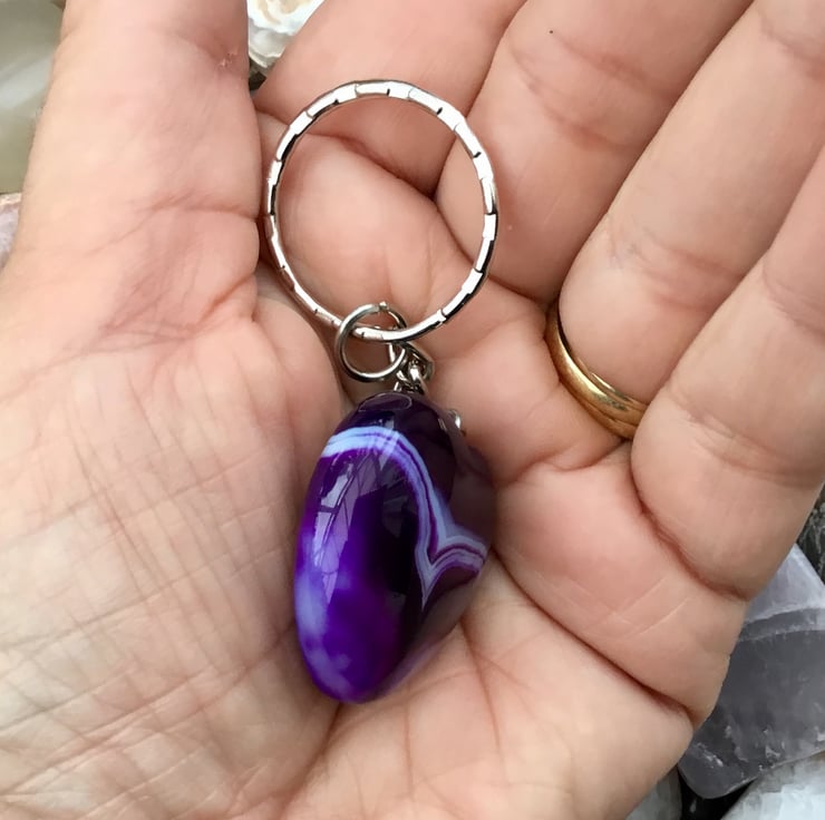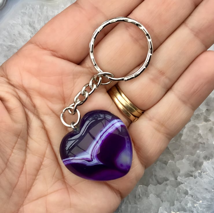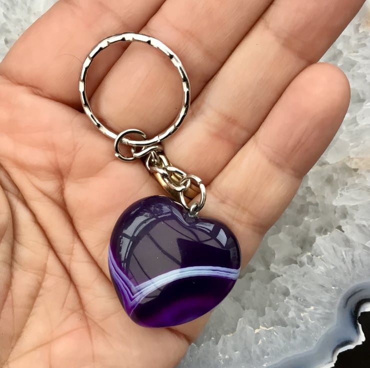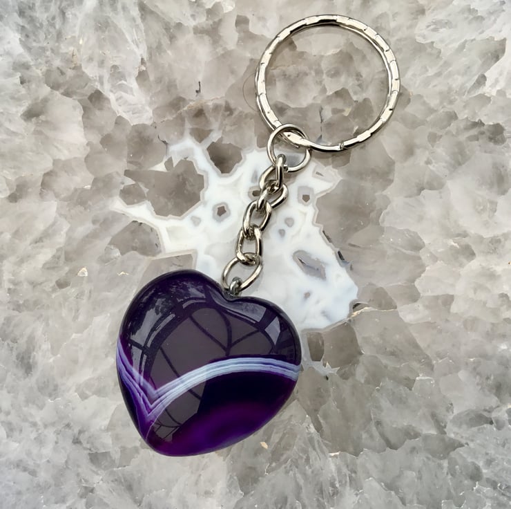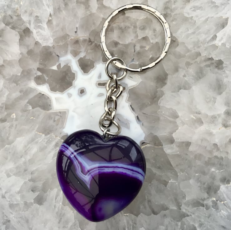Purple Heart! A beautiful Purple Agate Cushion Heart gemstone, made into a lovely Keyring, or handbag charm with Silvertone keychain and 2.5cm diameter split ring.