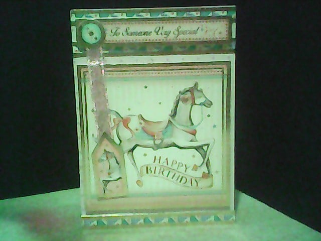 Fairground horse with attached tag.