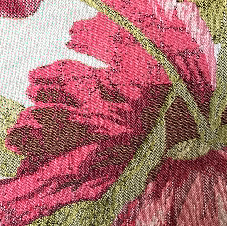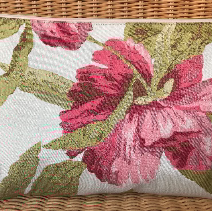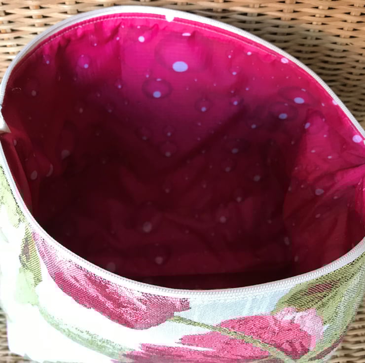 A useful toiletry bag with a pretty woven pattern featuring large pink flowers and green foliage on a cream background. The bag has a cream zip and the inside is fully lined with a water-resistant lining in pink with a pattern of white water droplets. The base of the bag is boxed giving lots of space inside.