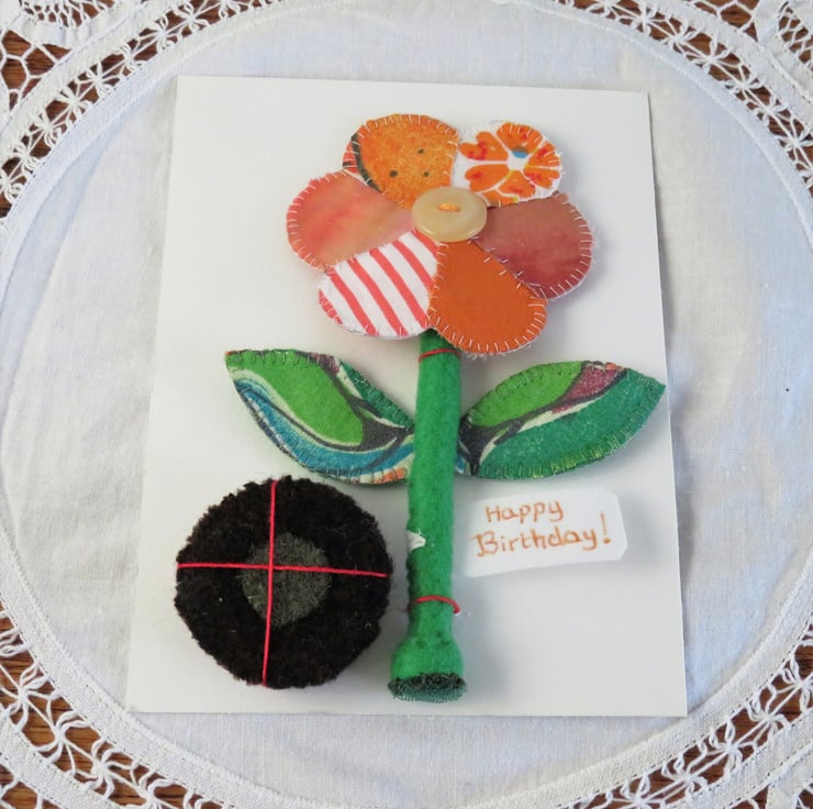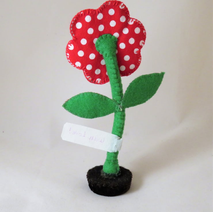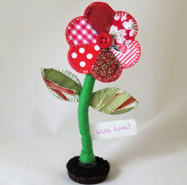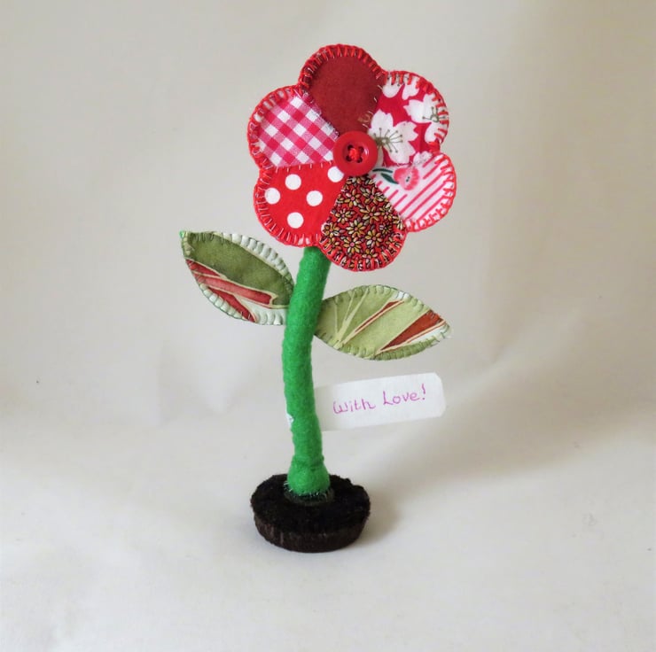 Vintage fabrics in shades of red and white, have been used to form the six petals of a simple flower shape. The petals have been hand-stitched to an interfacing background backed with red and white spotted fabric, and blanket stitched to edge. A red vintage button has been used for the flower centre. Green eco felt (commercially produced from recycled plastic bottles) covers a roll of wadding and is stitched to form the stem. The base of the stem is attached to vintage buttons, covered in green felt, and finished with a base of the 'hook side' of hook and loop fastening. The leaves are cut from vintage fabric backed with green eco felt. A plastic bottle top, covered in fabric, filled with wadding and with a circle of the 'loop side' of the fastening, forms the base.