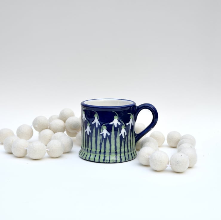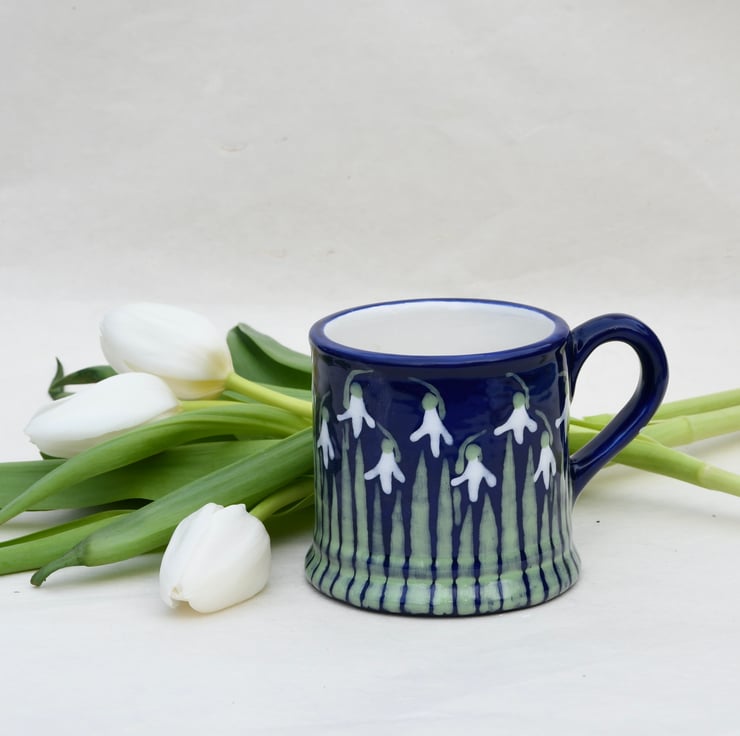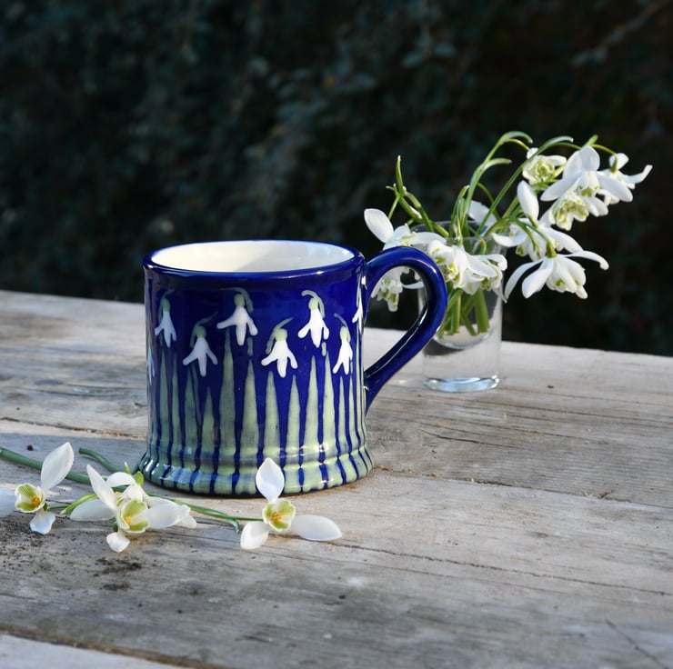 The Snowdrop Mug design with its beautiful, dark blue background and its hand painted white snowdrops all around the mug is both unusual and striking. A lovely gift for tea or coffee drinkers who adore snowdrops.