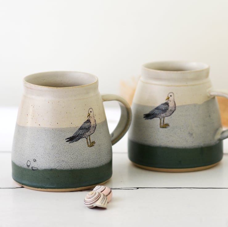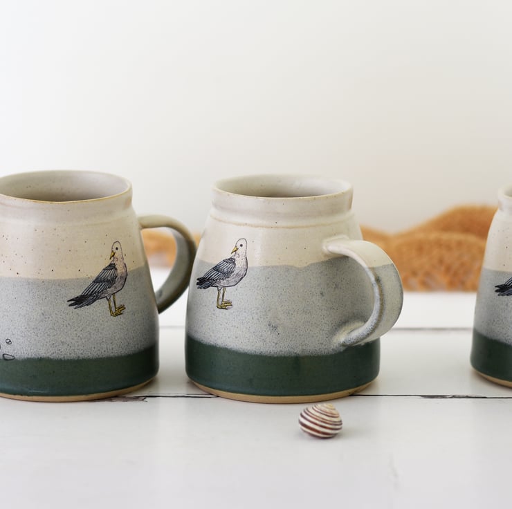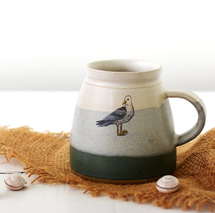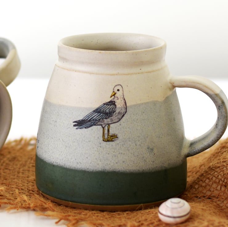 Hot drinks - coffee or tea - will taste great drunk from this ceramic mug handmade of flecked stoneware clay. Glazed inside and out in creamy white over pistachio over sea green. The seagull - hand-drawn by Zanna - has been fused deep into the glaze during a third firing to 850 degrees C.
