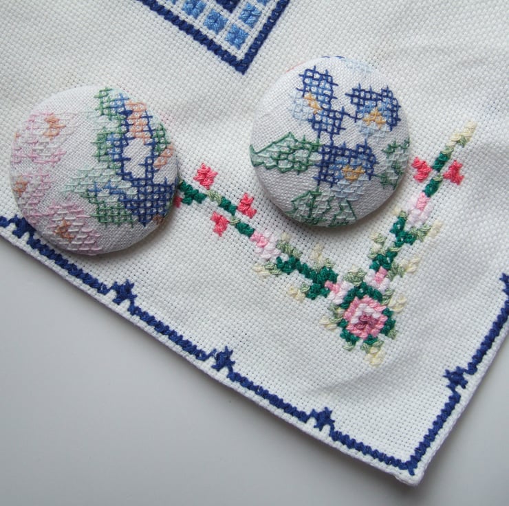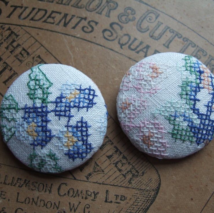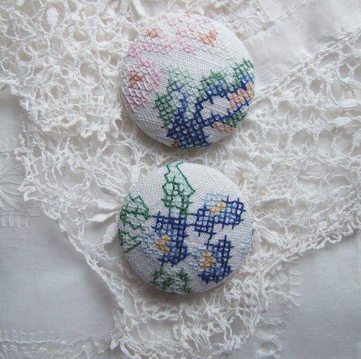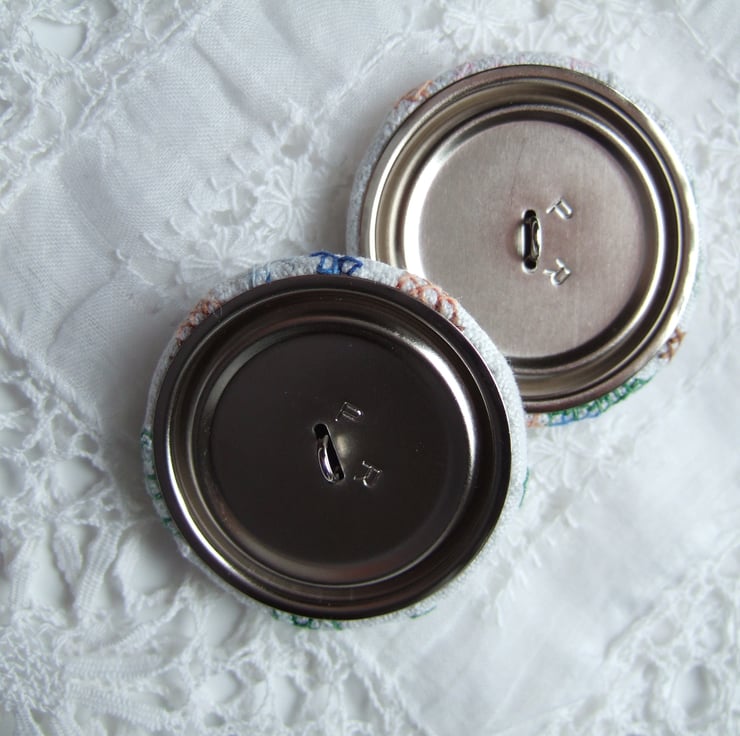 These two extra large metal buttons are covered in hand sewn vintage embroidery. Made from tiny fragments from an otherwise damaged embroidered tablecloth, which have been saved, and given a new lease of life.