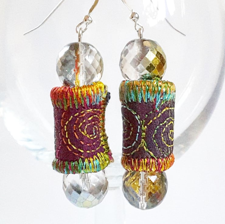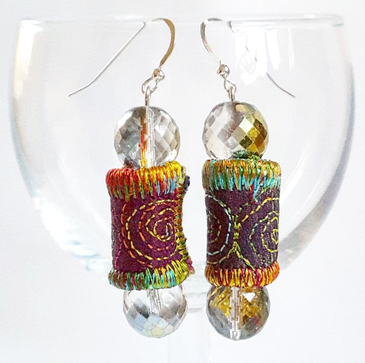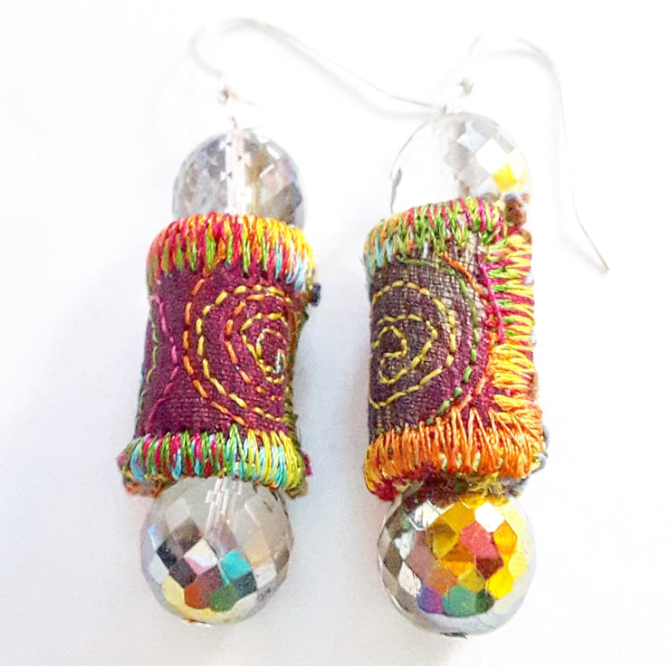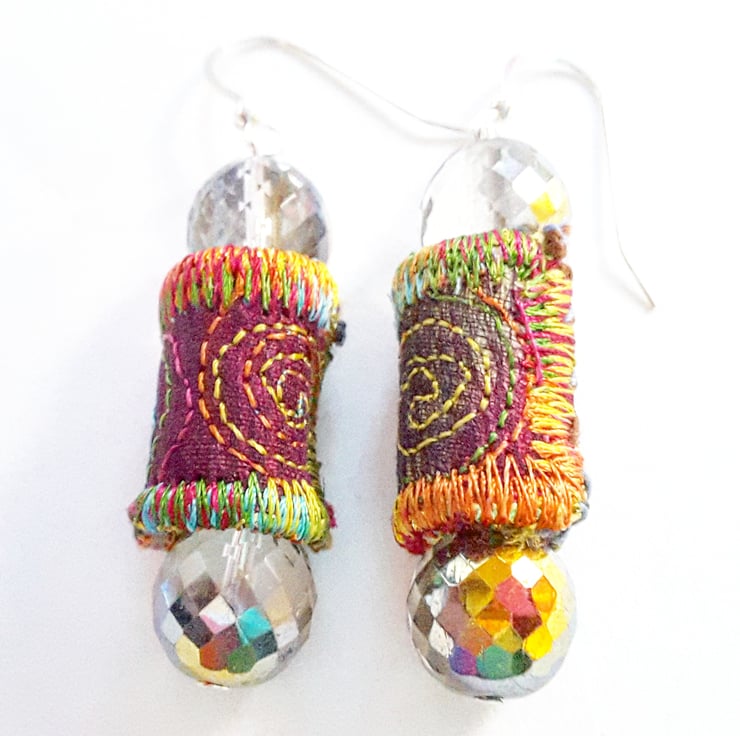 These are a pair of textile and glass bead earrings.