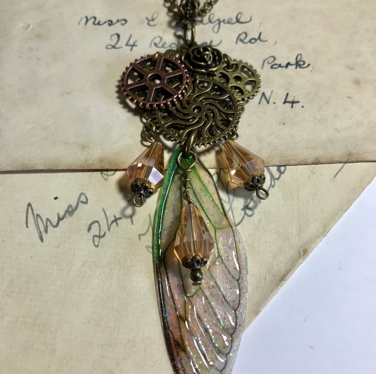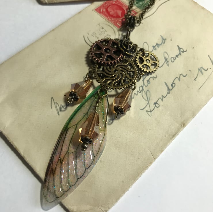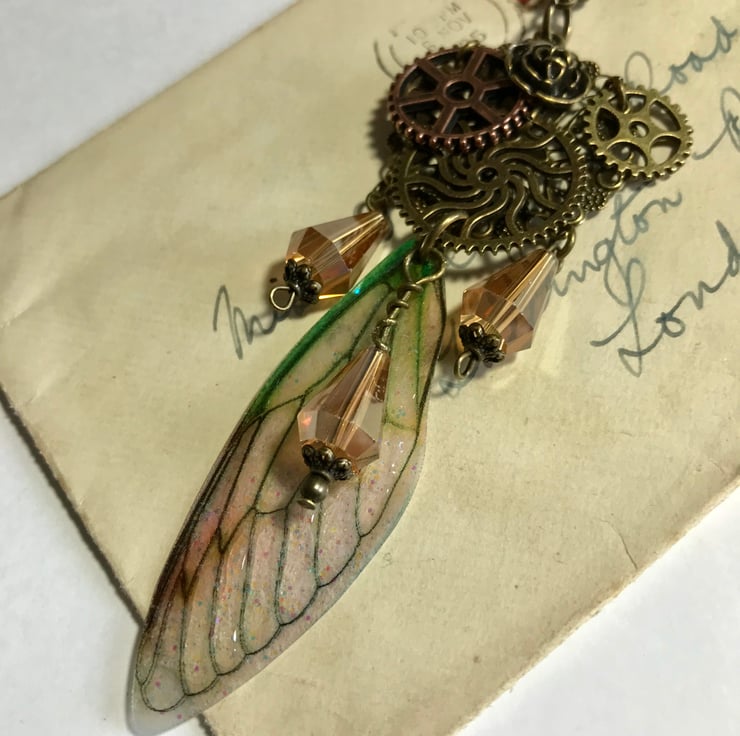 Hanging delicately beneath the bronze cogs and filigree metal work hangs a gorgeous sparkling fairy wing.