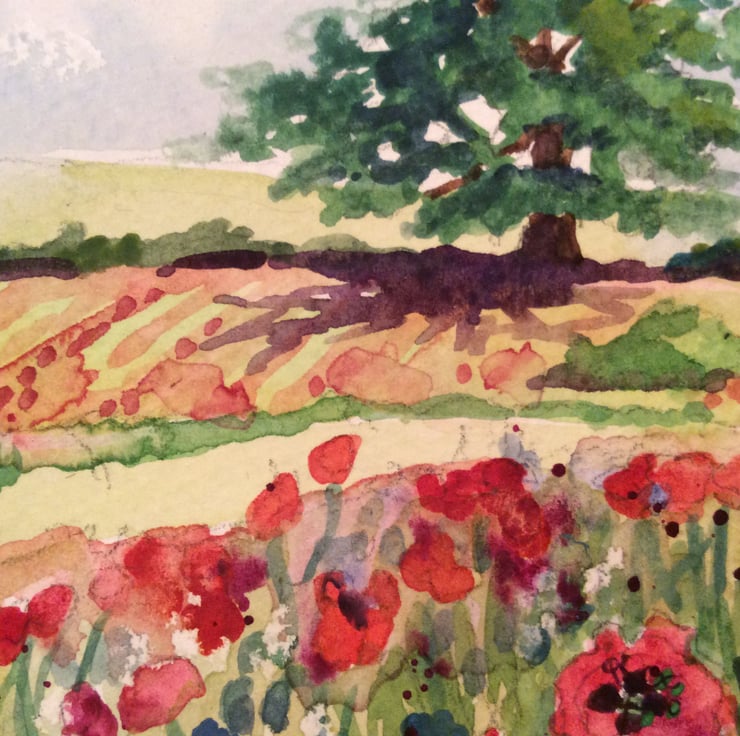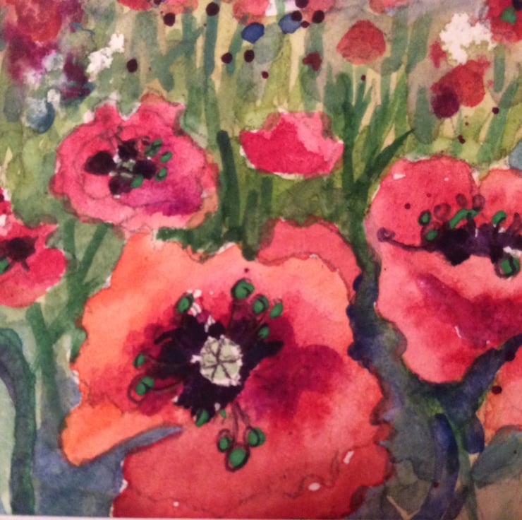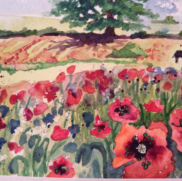 This is a handmade card which consists of an original watercolour painting mounted in a window framed card. The painting depicts a field of red poppies which become more impressionistic as they recede into the background. The painting can be easily removed from the card after it has been displayed and framed to form an original piece of artwork.